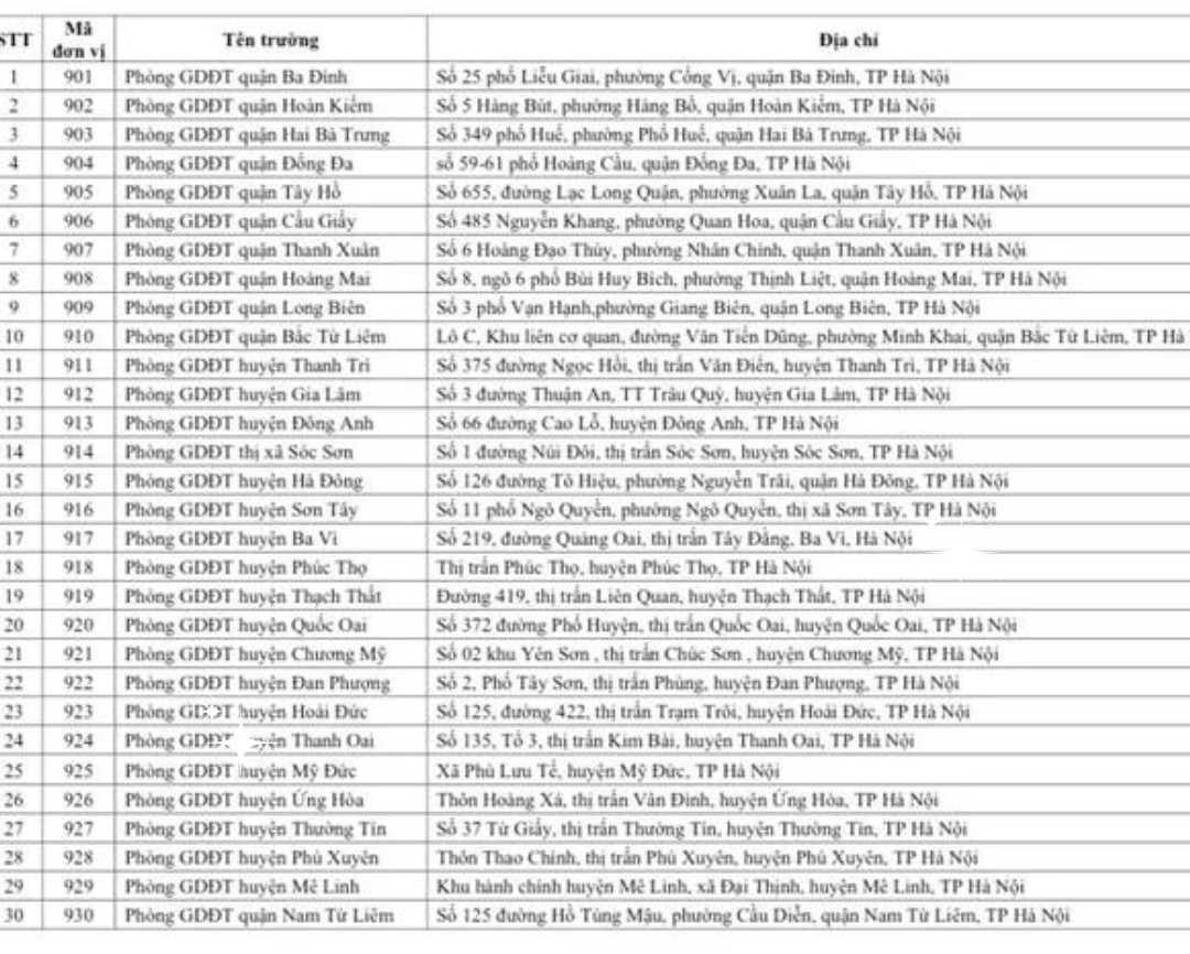 Nhằm giúp thí sinh tự do thuận tiện đăng ký dự thi, Sở GD&ĐT Hà Nội công bố danh sách 30 địa điểm tiếp nhận phiếu đăng ký dự thi tốt nghiệp THPT. Đây là các địa điểm thu nhận phiếu đăng ký dự thi tốt nghiệp THPT năm 2024 của thí sinh tự do trên địa bàn thành phố. Thí sinh cư trú tại quận, huyện, thị xã nào thì đăng ký dự thi tại Phòng GD&ĐT của quận, huyện, thị xã đó.