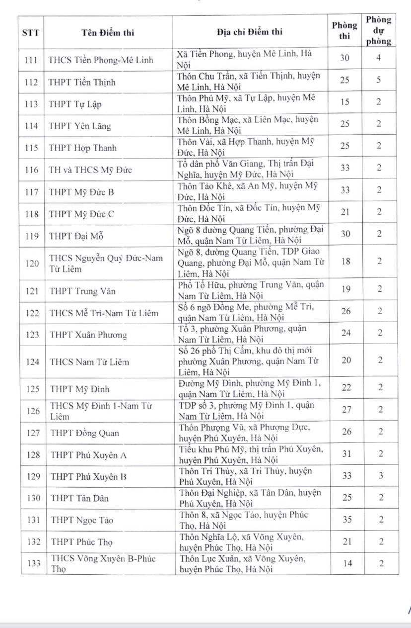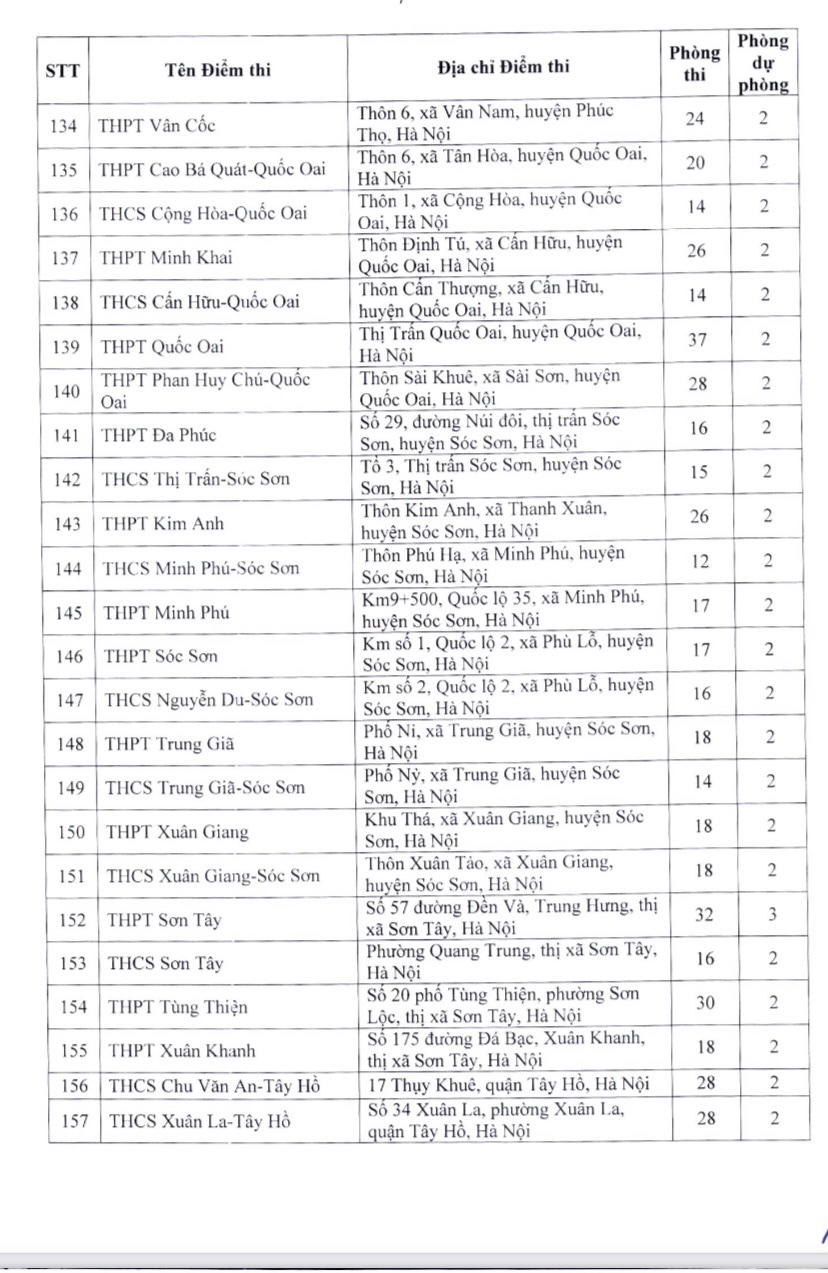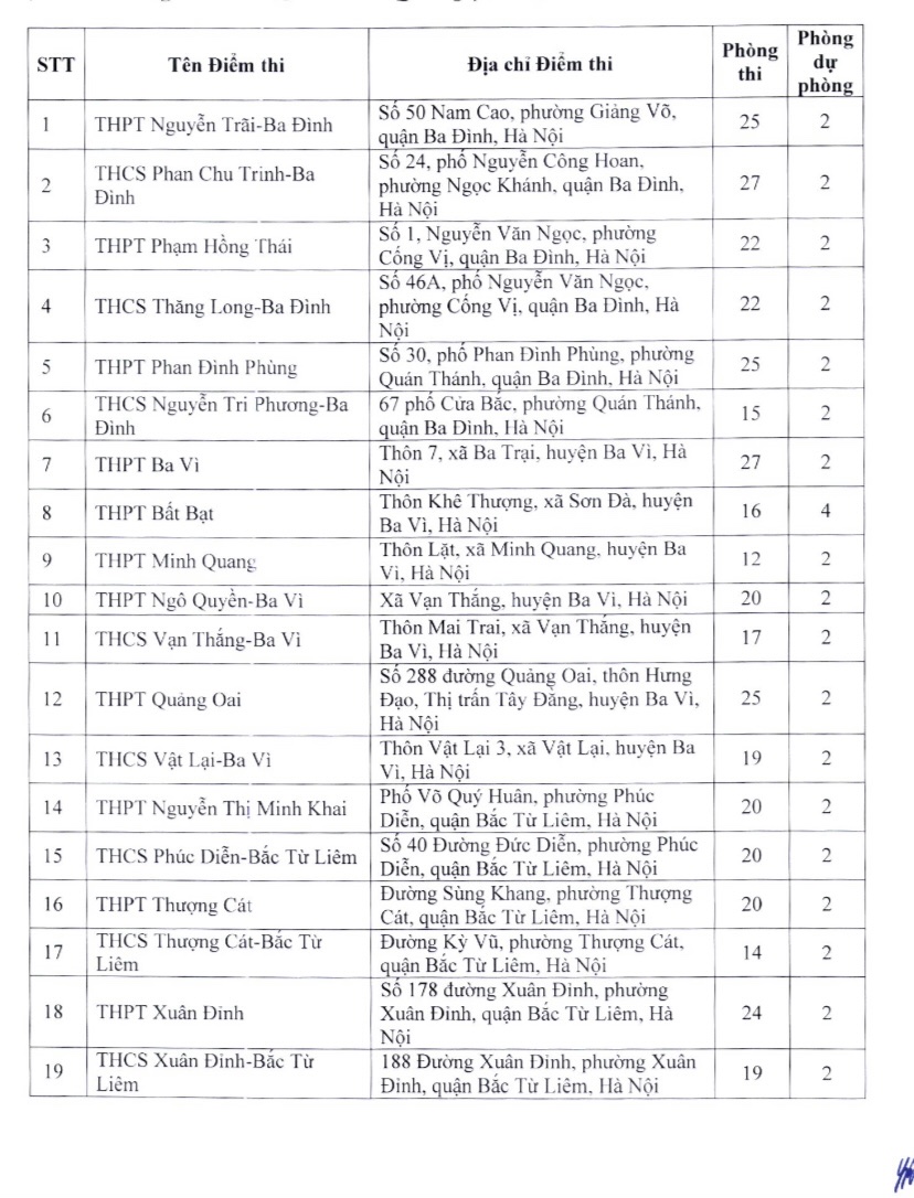 Một số điểm thi có nhiều phòng thi như Trung học Phổ thông Nguyễn Du-Thanh Oai (40 phòng thi); Trung học Phổ thông Xuân Mai (39 phòng thi); Trung học Phổ thông Khương Đình, Trung học Cơ sở Trần Duy Hưng-Cầu Giấy, Trung học Phổ thông Chúc Động (38 phòng thi); Trung học Phổ thông Chu Văn An, Trung học Phổ thông Quốc Oai (37 phòng thi); Trung học Phổ thông Ngọc Tảo (35 phòng thi); Trung học Phổ thông Cao Bá Quát-Gia Lâm, Trung học Phổ thông Chuyên Nguyễn Huệ, Trung học Cơ sở Yên Nghĩa-Hà Đông (34 phòng thi)...