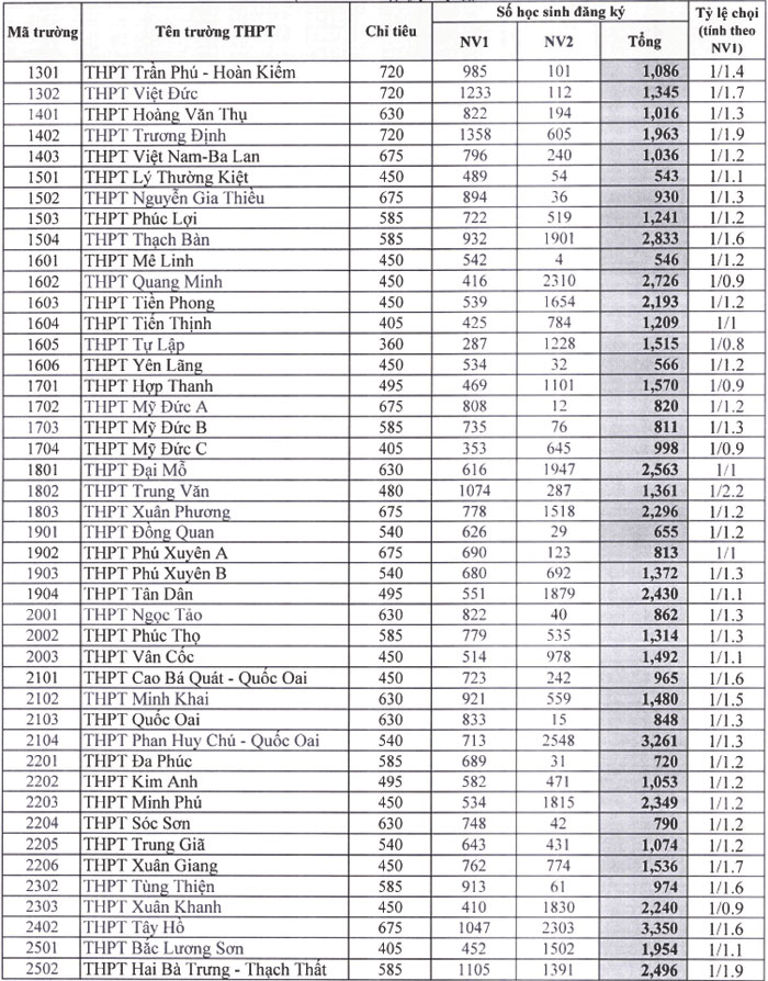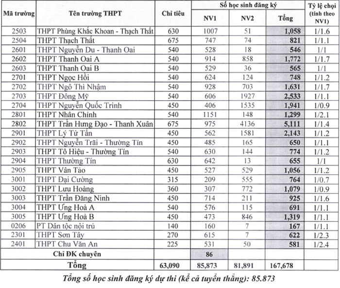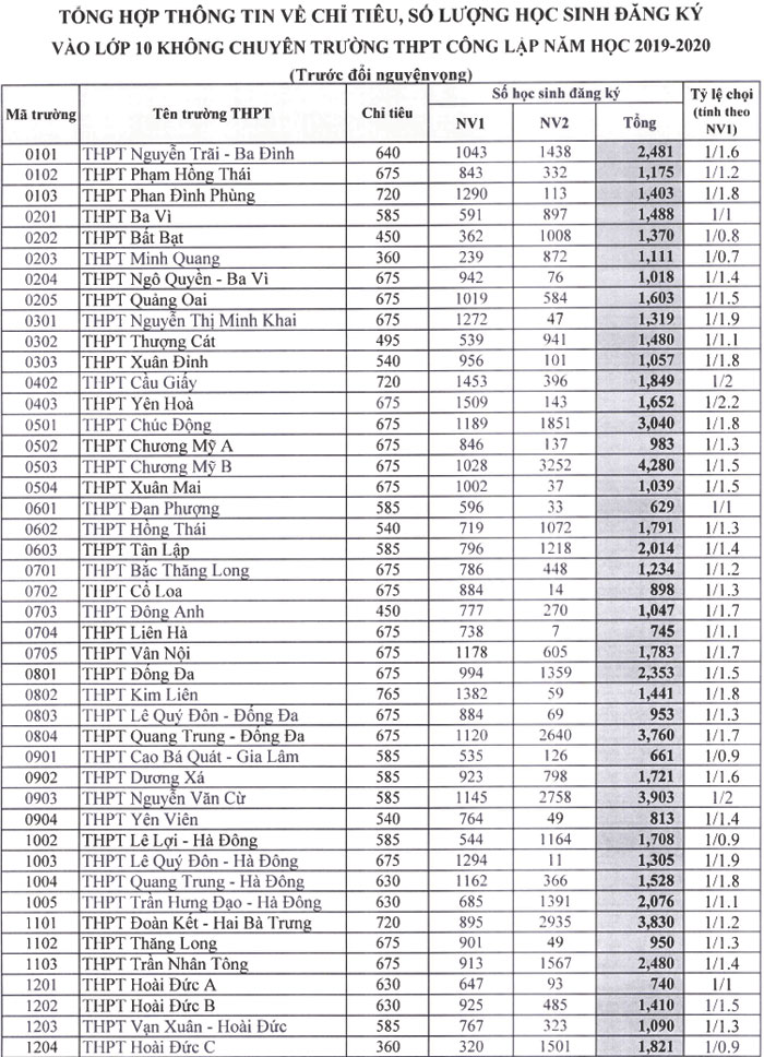 Sáng 14/5, Sở Giáo dục và Đào tạo Hà Nội công bố số lượng học sinh đăng ký dự tuyển vào từng trường THPT công lập năm học 2019-2020, hệ không chuyên. Tổng số nguyện vọng 1 (NV1) là hơn 85.870, NV2 là 81.800, trong khi chỉ tiêu tuyển sinh là 63.090.