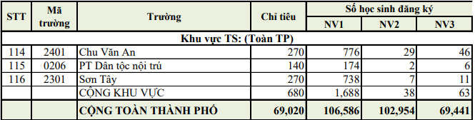 Đừng đầu chính là THPT Yên Hòa với tỉ lệ chọi 1/3,03 (trong số hơn 3 thí sinh sẽ có 1 thí sinh đỗ), tiếp theo đó là THPT Chu Văn An (1/2,87), THPT Sơn Tây (1/2,73), THPT Nhân Chính (1/2,53), THPT Lê Quý Đôn - Hà Đông (1/2,51)...