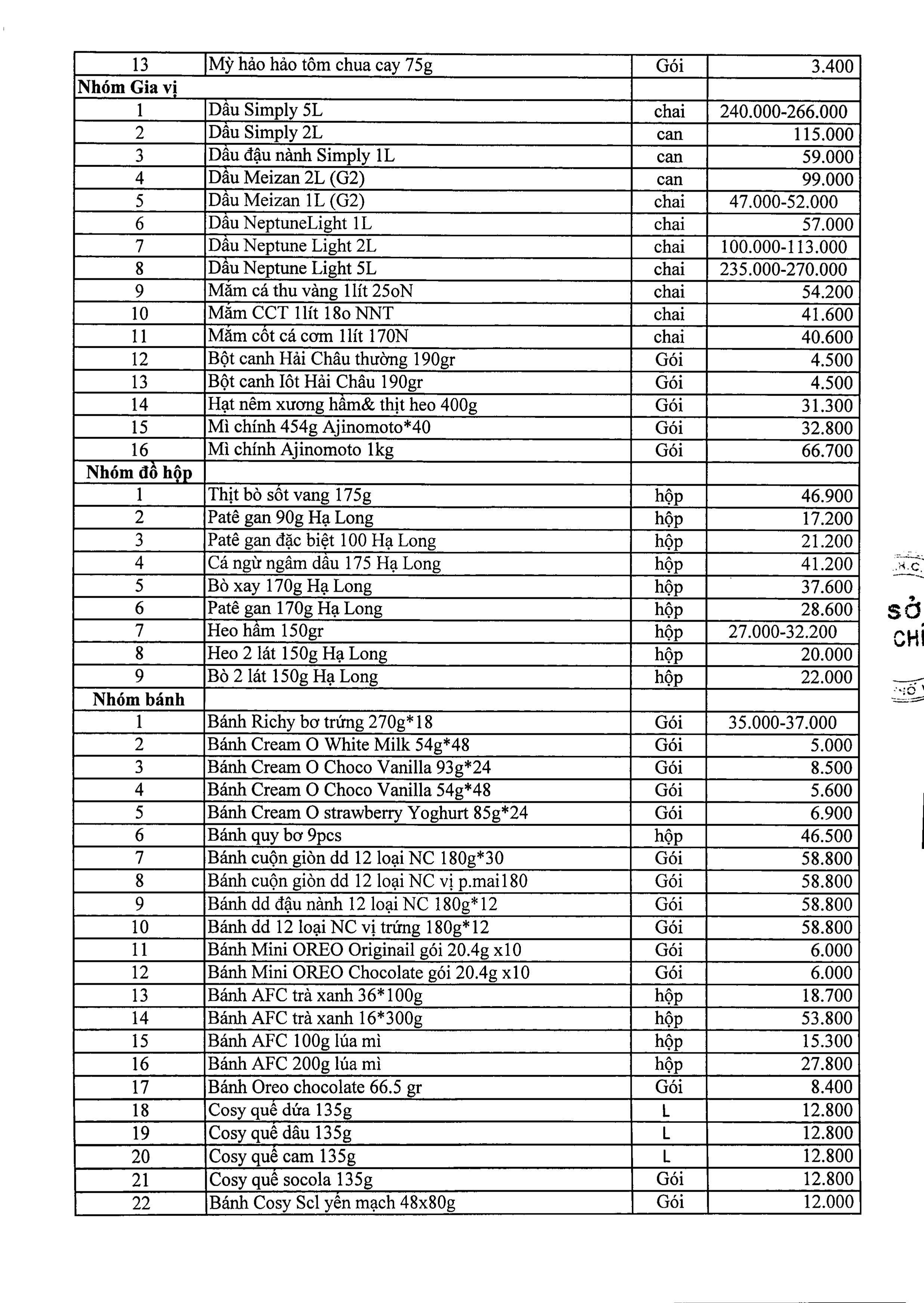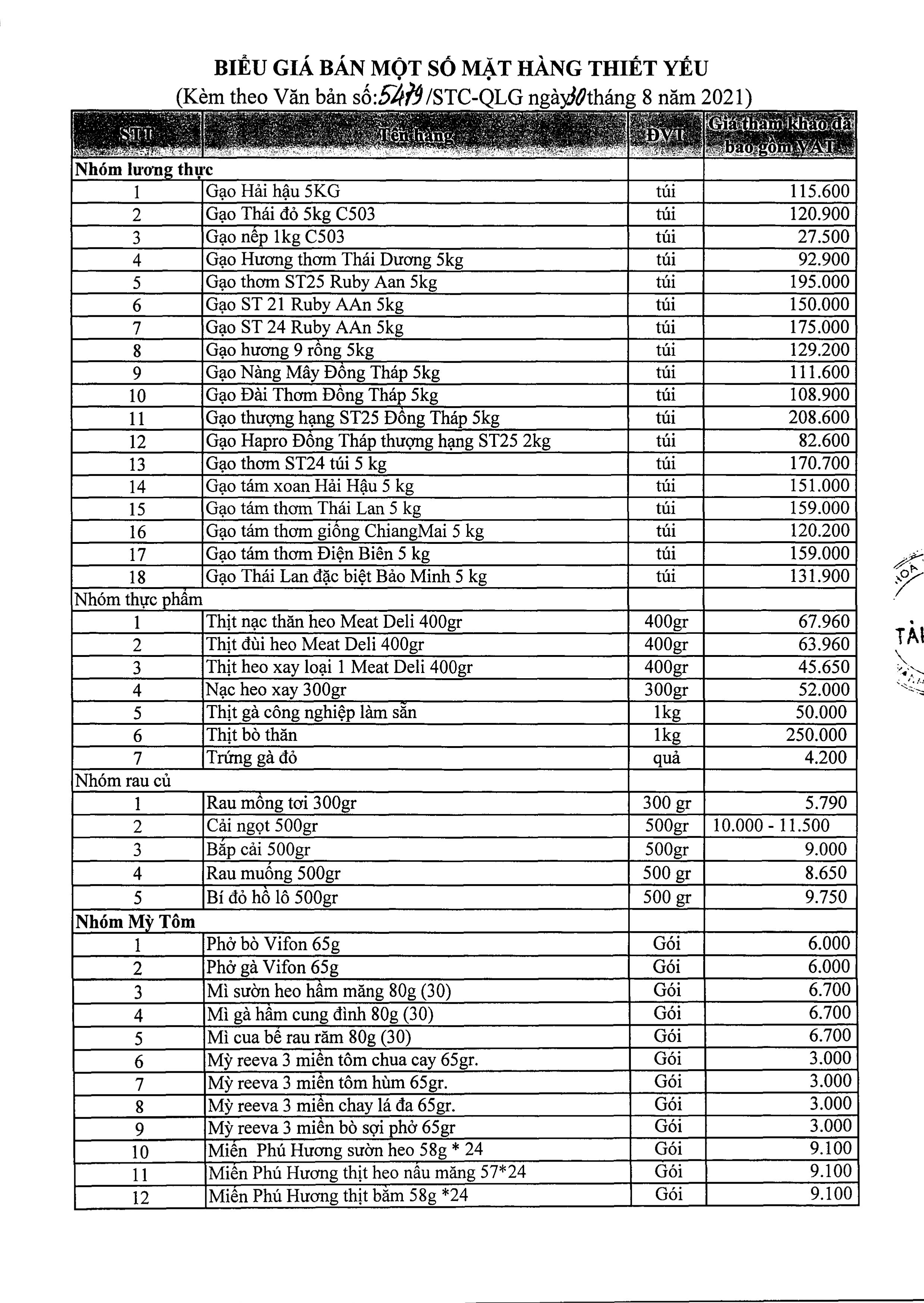 Danh mục giá các mặt hàng thiết yếu cụ thể như sau: