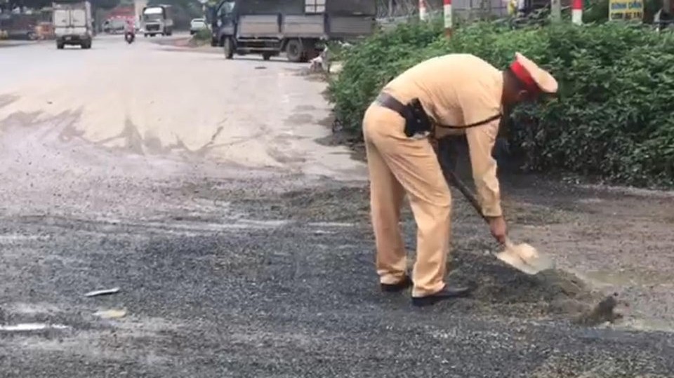 Hình ảnh những chiến sĩ CSGT mượn xẻng, vận động xe tải chở đá mạt tham gia lấp "ổ gà, ổ trâu" trên đường, giúp người dân đi lại an toàn đã để lại nhiều tình cảm tốt đẹp trong lòng người dân Thủ đô.