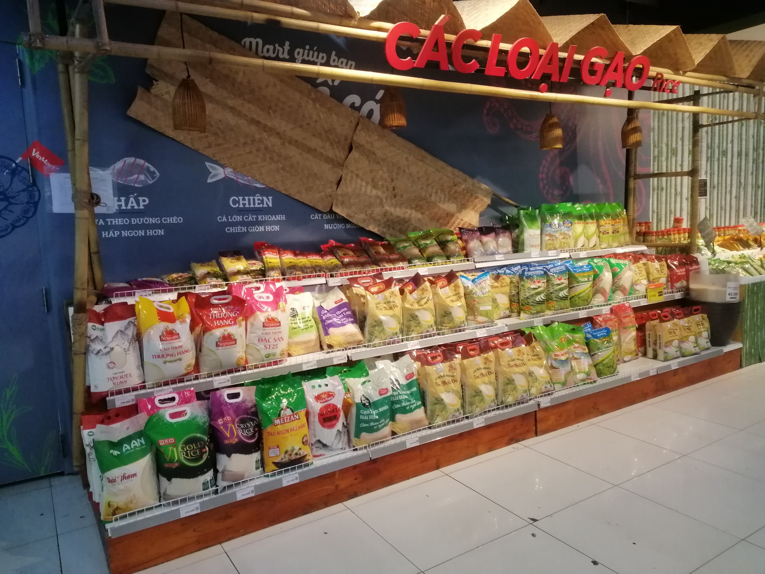 Gian hàng gạo của siêu thị VinMart vẫn rất phong phú về số lượng gạo