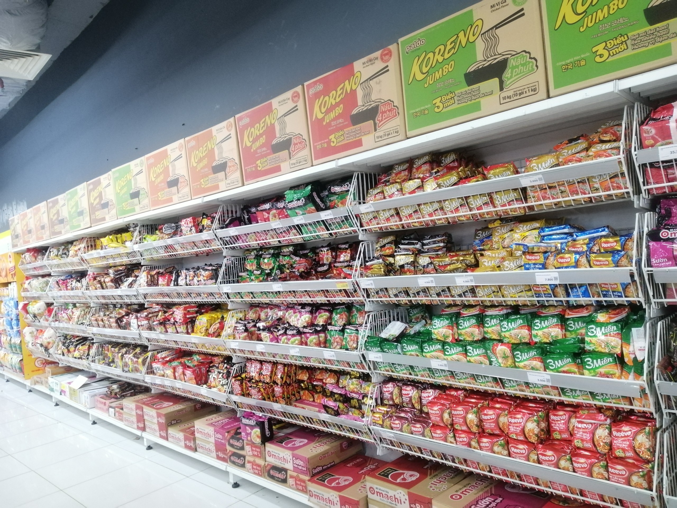 Ngoài các mặt hàng tươi sống thì tại siêu thị Vinmart Royal City ( Nguyễn Trãi, Thanh Xuân) các loại thực phẩm khô như mì tôm, miến, phở, cháo ăn liền đảm bảo cung ứng đủ cho số lượng lớn khách hàng