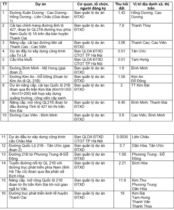 Trong Nghị quyết 21 về việc phê duyệt danh mục các công trình, dự án thu hồi đất năm 2021 đã được HĐND TP Hà Nội thông qua, huyện Thanh Oai có 16 dự án giao thông.