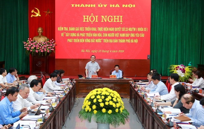 Phát biểu kết luận Hội nghị, đồng chí Võ Văn Thưởng, Trưởng ban Tuyên giáo Trung ương, Trưởng đoàn kiểm tra đánh giá cao Thành ủy Hà Nội đã chuẩn bị tích cực, chu đáo nội dung, tham luận đóng góp, chỉ ra nhiều vấn đề lý luận và thực tiễn trong việc thực hiện Nghị quyết số 33-NQ/TW. Đồng chí đánh giá, Thành phố đã ban hành và triển khai nhiều đề án, chương trình, Quy hoạch phát triển văn hóa Hà Nội đến năm 2020, định hướng đến năm 2030. Hà Nội cũng là địa phương đi đầu trong việc xây dựng và thực hiện nếp sống văn minh trong việc cưới, việc tang và tố chức lễ hội,... tiếp tục xứng đáng là trung tâm văn hóa hàng đầu của cả nước, là nơi hội tụ, kết tinh, lan tỏa những giá trị cao quý nhất của dân tộc Việt Nam.