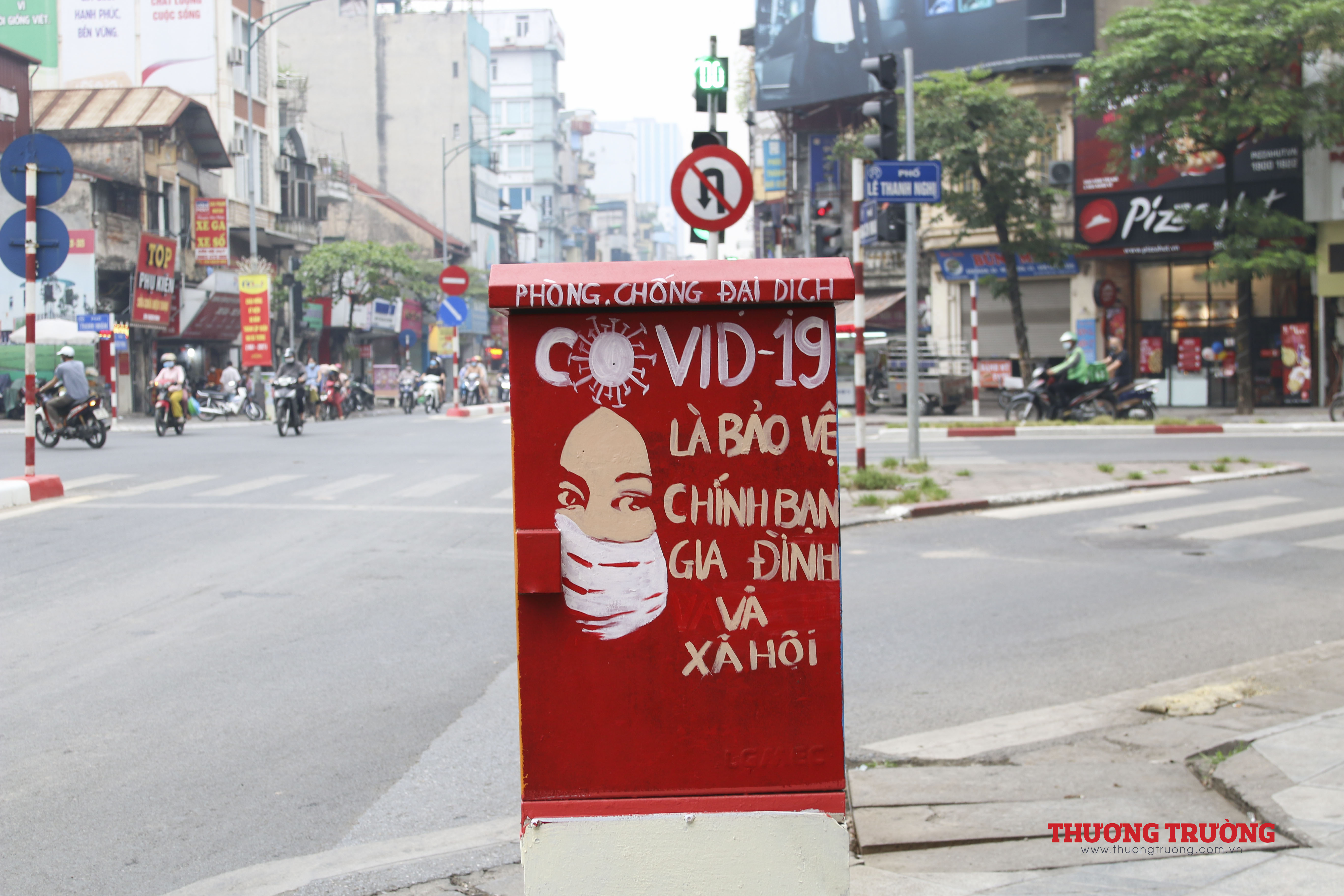 Ngã tư phố Bạch Mai - Lê Thanh Nghị (quận Hai Bà Trưng), xuất hiện những hình ảnh bắt mắt trên những bốt điện bức tranh cổ động về đội ngũ y, bác sĩ trong công tác phòng, chống dịch Covid-19.