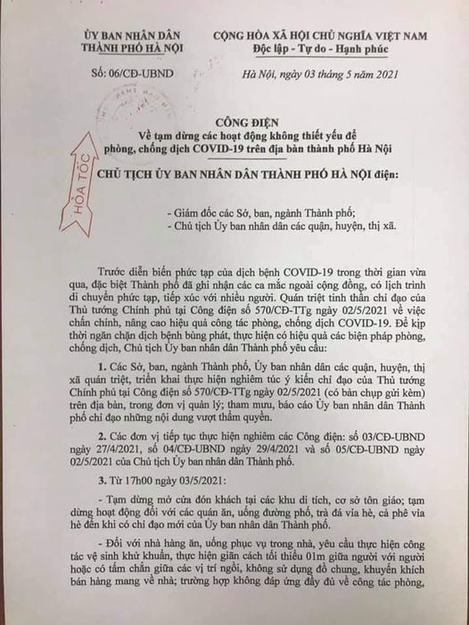 Ngày 3/5, Chủ tịch UBND TP Hà Nội Chu Ngọc Anh có công điện về việc tạm dừng các hoạt động không thiết yếu để phòng, chống dịch COVID-19 trên địa bàn thành phố.