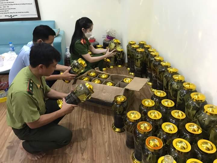 Đội 4 Phòng Cảnh sát môi trường - CATP Hà Nội phối hợp với Đội QLTT số 11, Cục QLTT Hà Nội, Đội Cảnh sát kinh tế - Công an quận Hà Đông và Đội Kiểm lâm cơ động phòng cháy và chữa cháy rừng số 1, Chi cục kiểm lâm Hà Nội đột xuất kiểm, phát hiện kho rượu với hàng trăm bình rượu "động vật" không nguồn gốc xuất xứ.