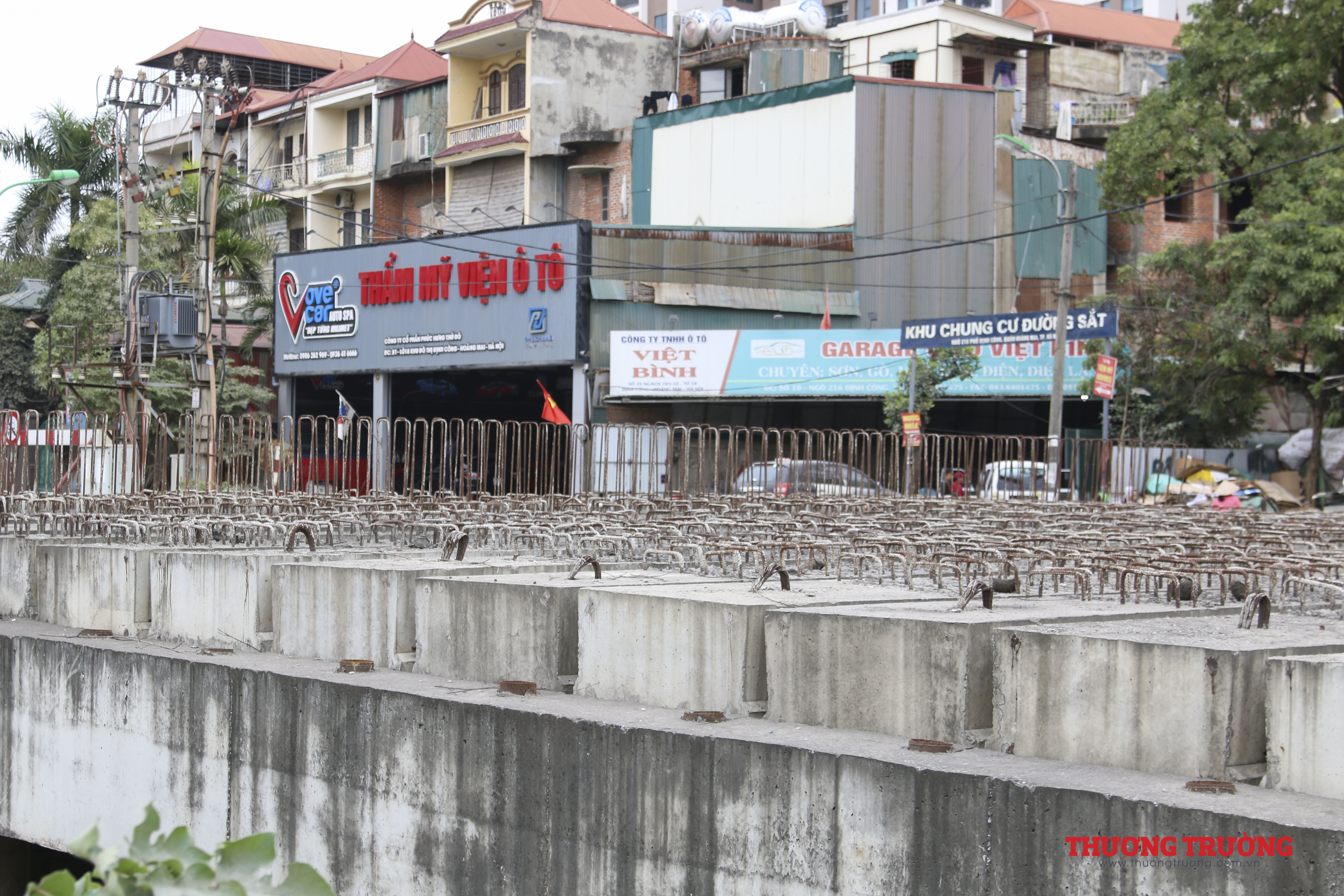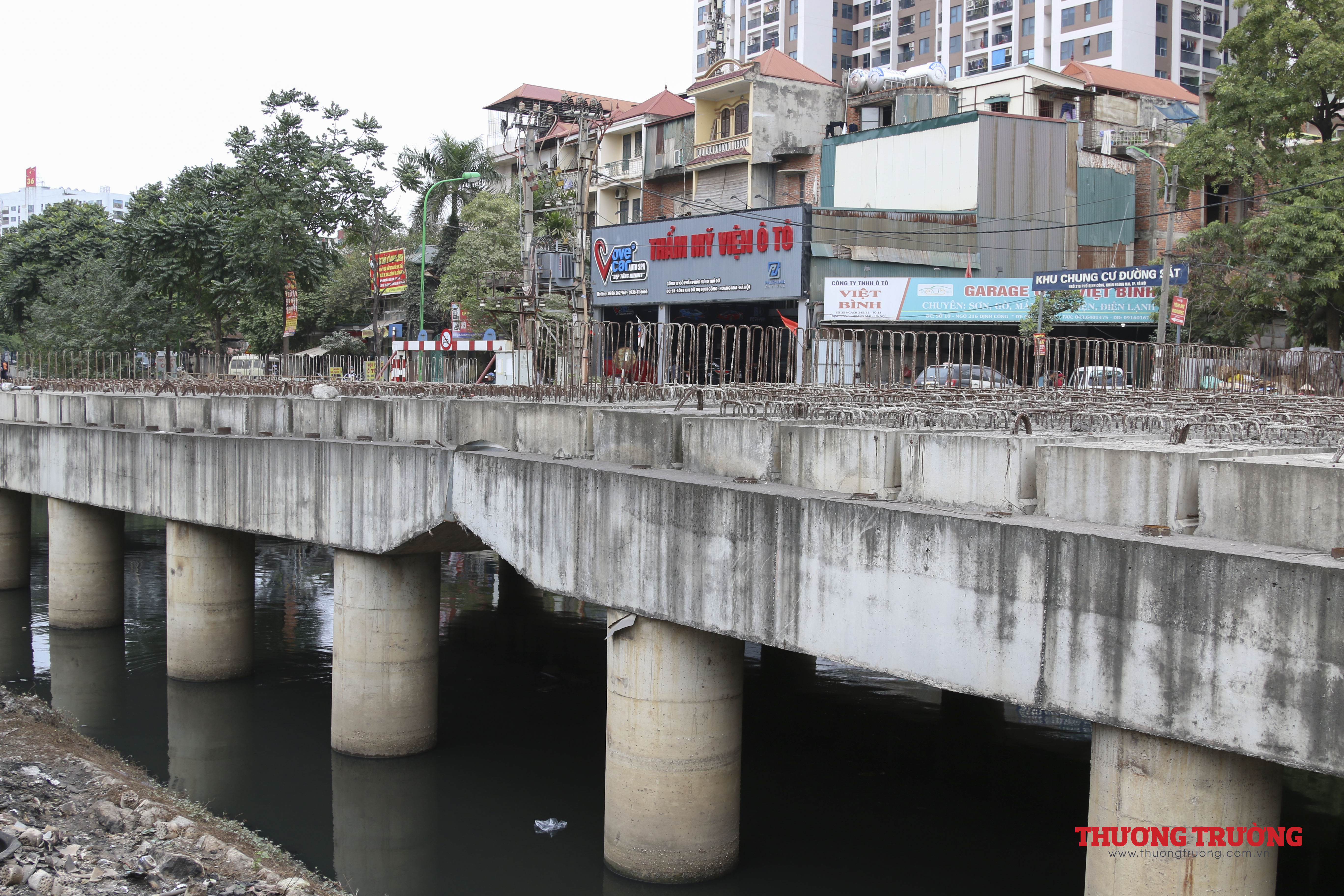Cầu Đền Lừ mới thi công xong phần chân đế, nằm dang dở do chưa hoàn thiện hai bên.