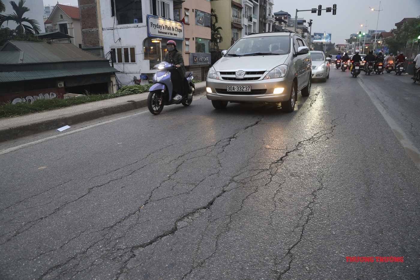 Mặt đường Âu Cơ chi chít ổ gà, vết nứt rảnh, như 'trận địa' giăng bẫy người đi đường khiến người tham gia giao thông vô cùng khổ sở khi đi qua đây.