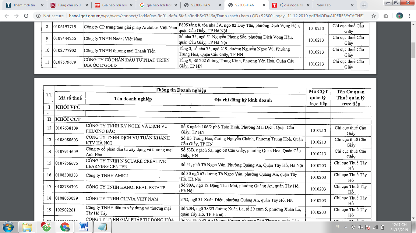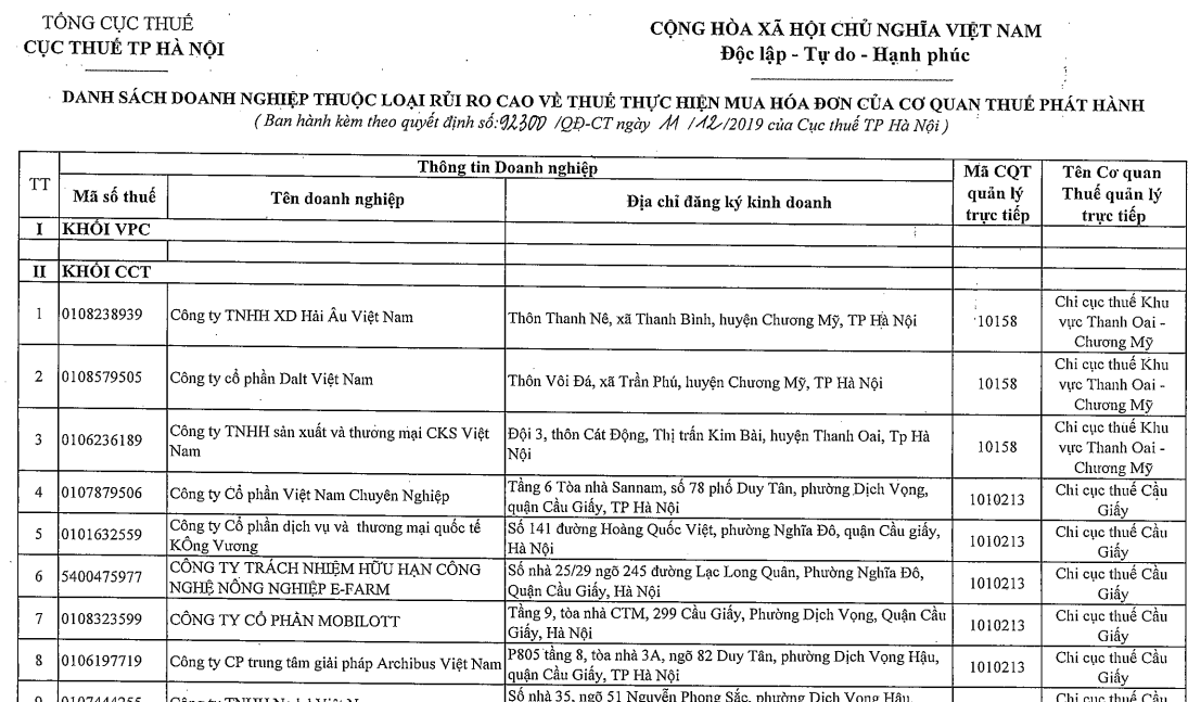 Trong bản danh sách liệt kê, có 11 doanh nghiệp thuộc sự quản lý trực tiếp của Chi cục thuế Cầu Giấy. Điển hình như CTCP MOBILOT, MST 0108323599 có trụ sở tại Tầng 9, tòa nhà CTM, 299 Cầu Giấy, Phường Dịch Vọng, Quận Cầu Giấy, Hà Nội; Công ty TNHH Nadal Việt Nam, MST 0107444255 có trụ sở tại Số 19 liền kề 42, khu đô thị vân canh, Xã Vân Canh, Huyện Hoài Đức, Hà Nội;...