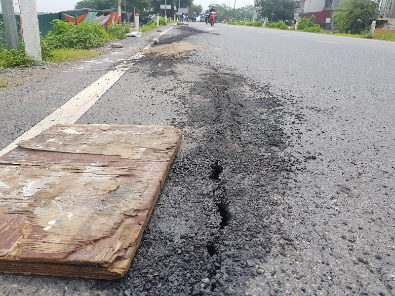 Sáng 6/5, có mặt tại nơi xảy ra sự cố, PV Thương Trường ghi nhận nhà thầu thi công bể chứa nước có xử lý các khe nứt gãy bằng trát vữa xi măng, nhựa đường. Tuy nhiên, các khe nứt gãy ngày càng mở rộng gây nguy hiểm và mất an toàn đối với người tham gia giao thông.
