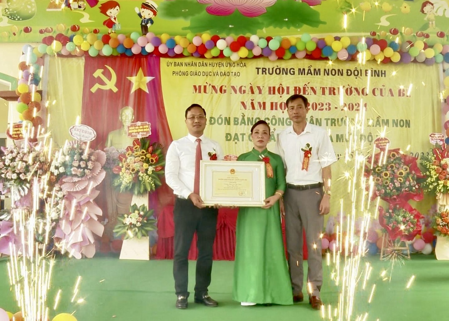 Tại trường Mầm non Đội Bình, đồng chí Nguyễn Tiến Thiết - Phó Bí thư Huyện ủy, Chủ tịch UBND huyện đã đến dự chung vui với ngày hội đến trường và trao Bằng công nhận Trường đạt chuẩn Quốc gia mức độ 2, cùng dự có đồng chí Ngô Văn Giang - UVBTV, Trưởng ban Tổ chức Huyện ủy; đồng chí Trần Văn Hiền - Phó Chủ tịch HĐND huyện; lãnh đạo một số phòng, ban của huyện.