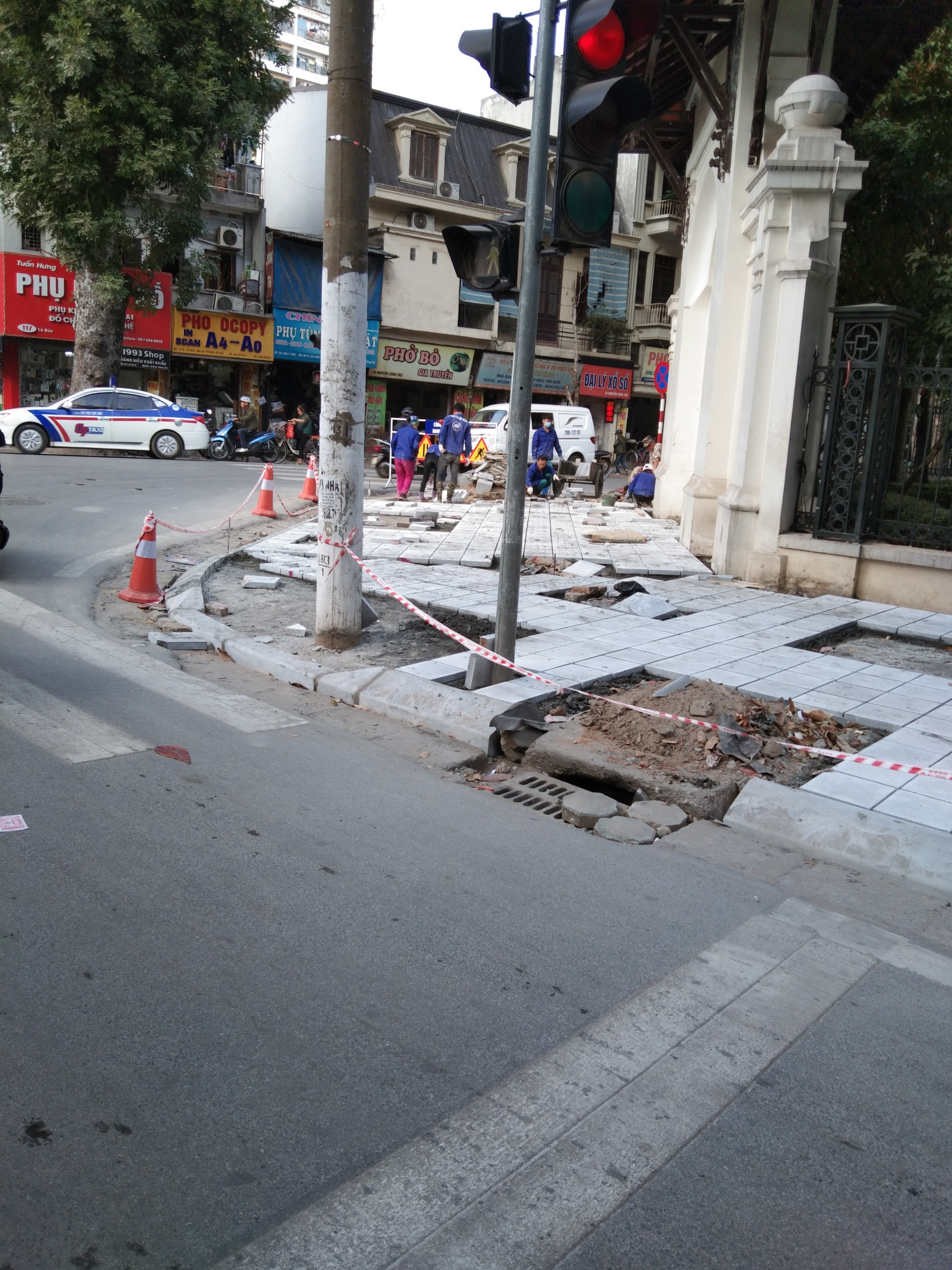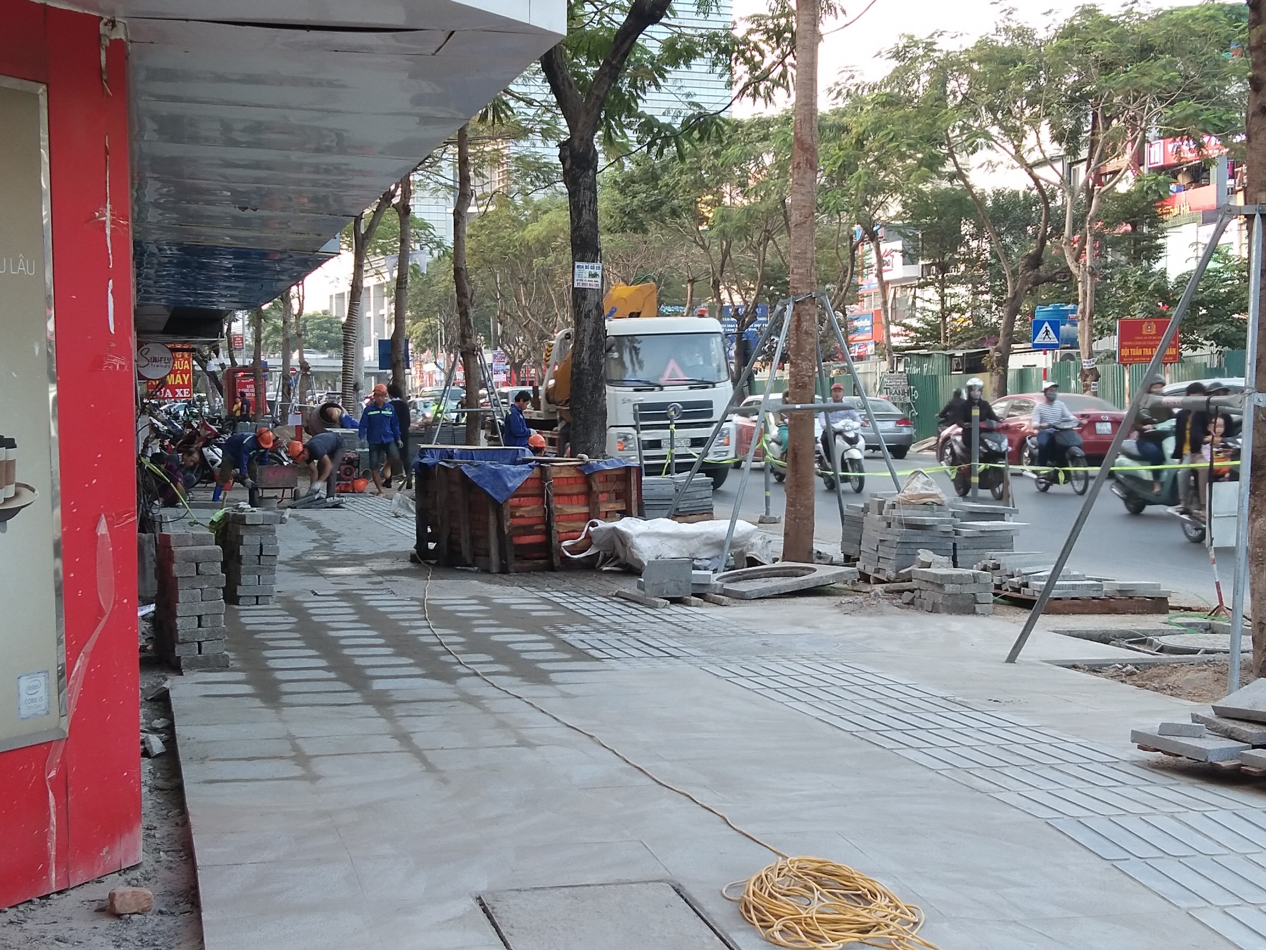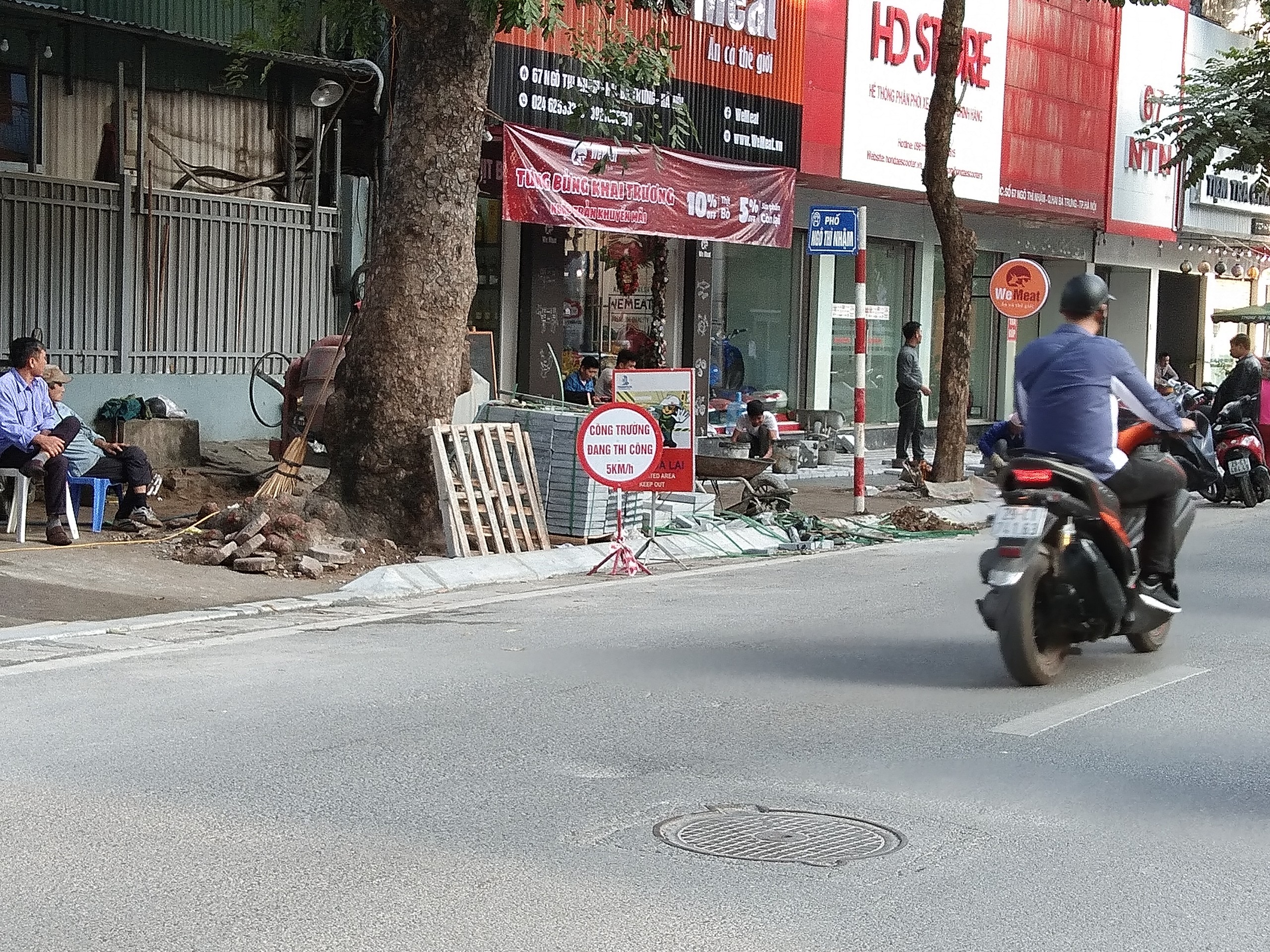 Vì đang trong quá trình thi công nên gạch đá, rào chắn nằm ngổn ngang tại các công trình. Ảnh: Thi công vỉa hè trên phố Thái Hà.