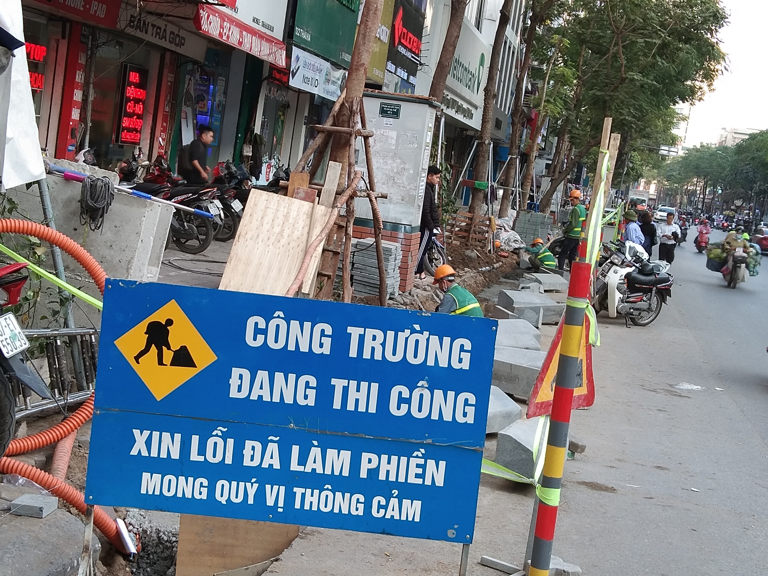 Những ngày cuối năm, nhiều tuyến phố tại Hà Nội lại đào đường vỉa hè để thi công lát gạch, bó vỉa. Cũng chính vì thế mà người dân mỗi khi đi qua những đoạn đường này rất khổ sở, cửa hàng kinh doanh phải đóng cửa, người dân xung quanh thì chịu sự ô nhiễm.