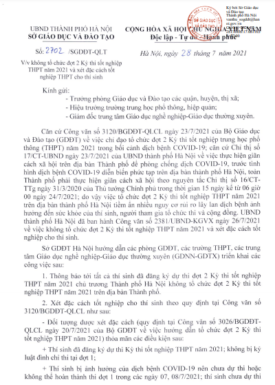 Ngày 28/7, Sở GD&ĐT Hà Nội đã có văn bản gửi trưởng phòng GD&ĐT, hiệu trưởng các nhà trường về việc không tổ chức đợt 2 kỳ thi tốt nghiệp THPT năm 2021 và xét đặc cách tốt nghiệp THPT cho thí sinh.