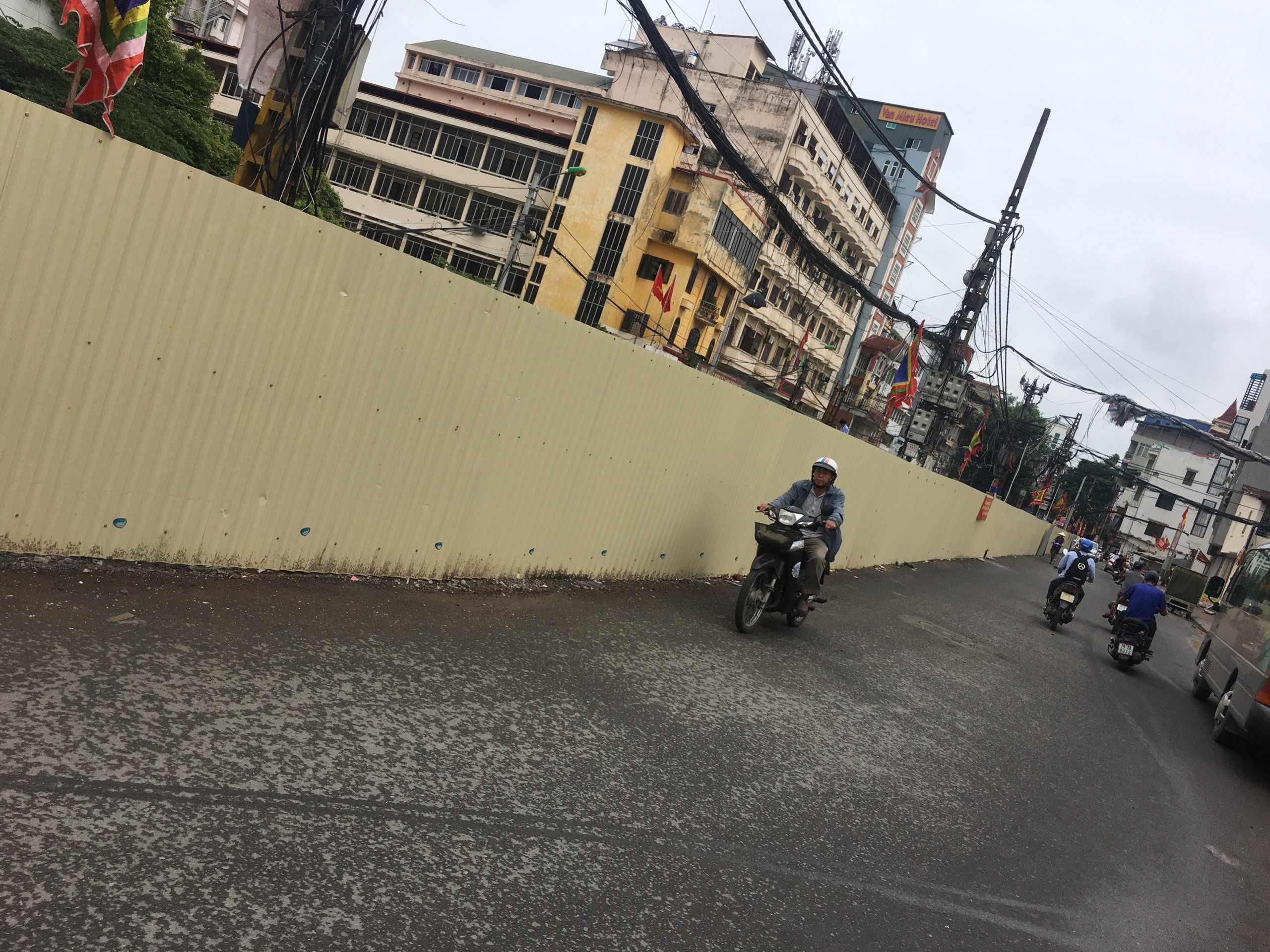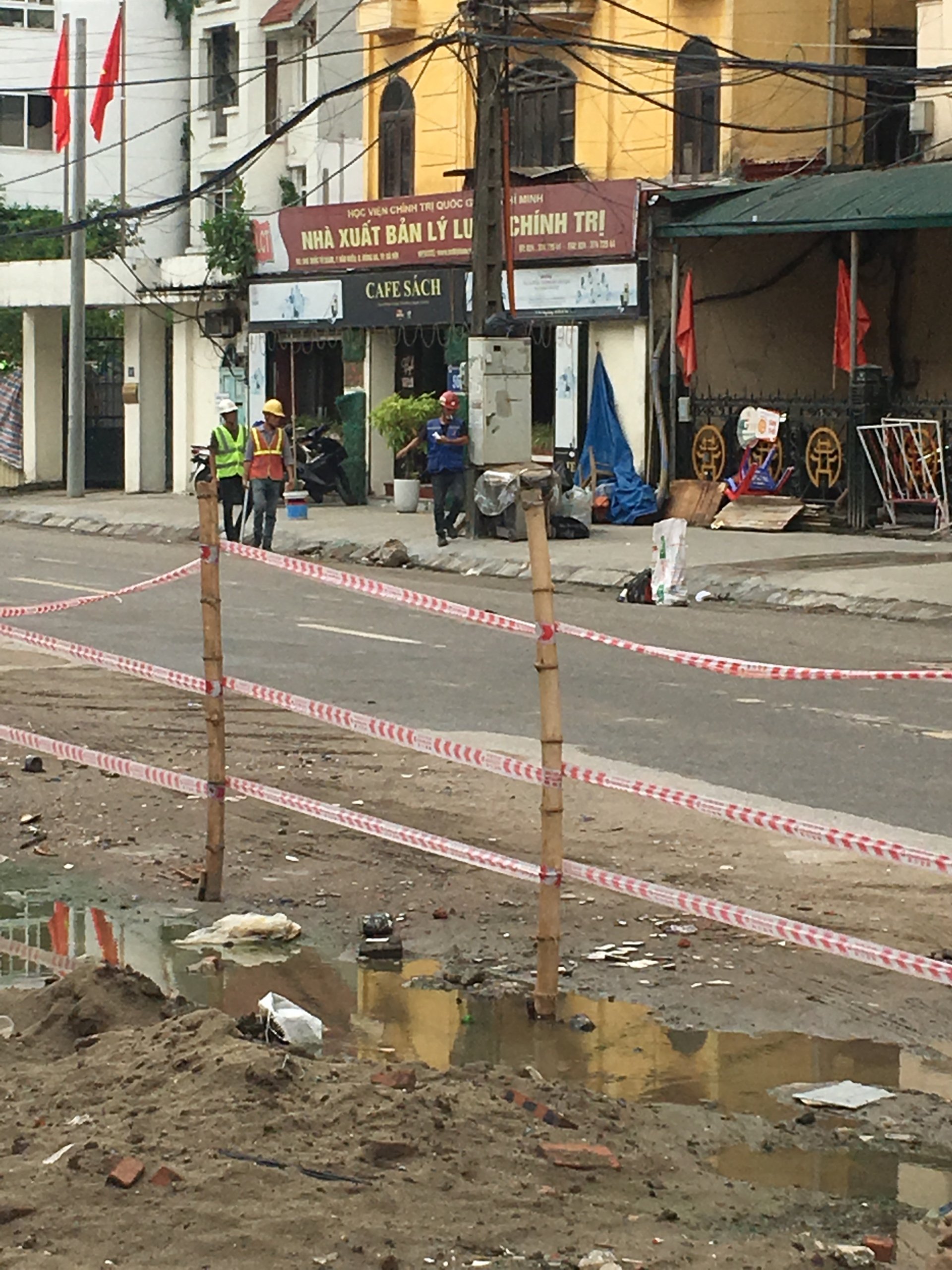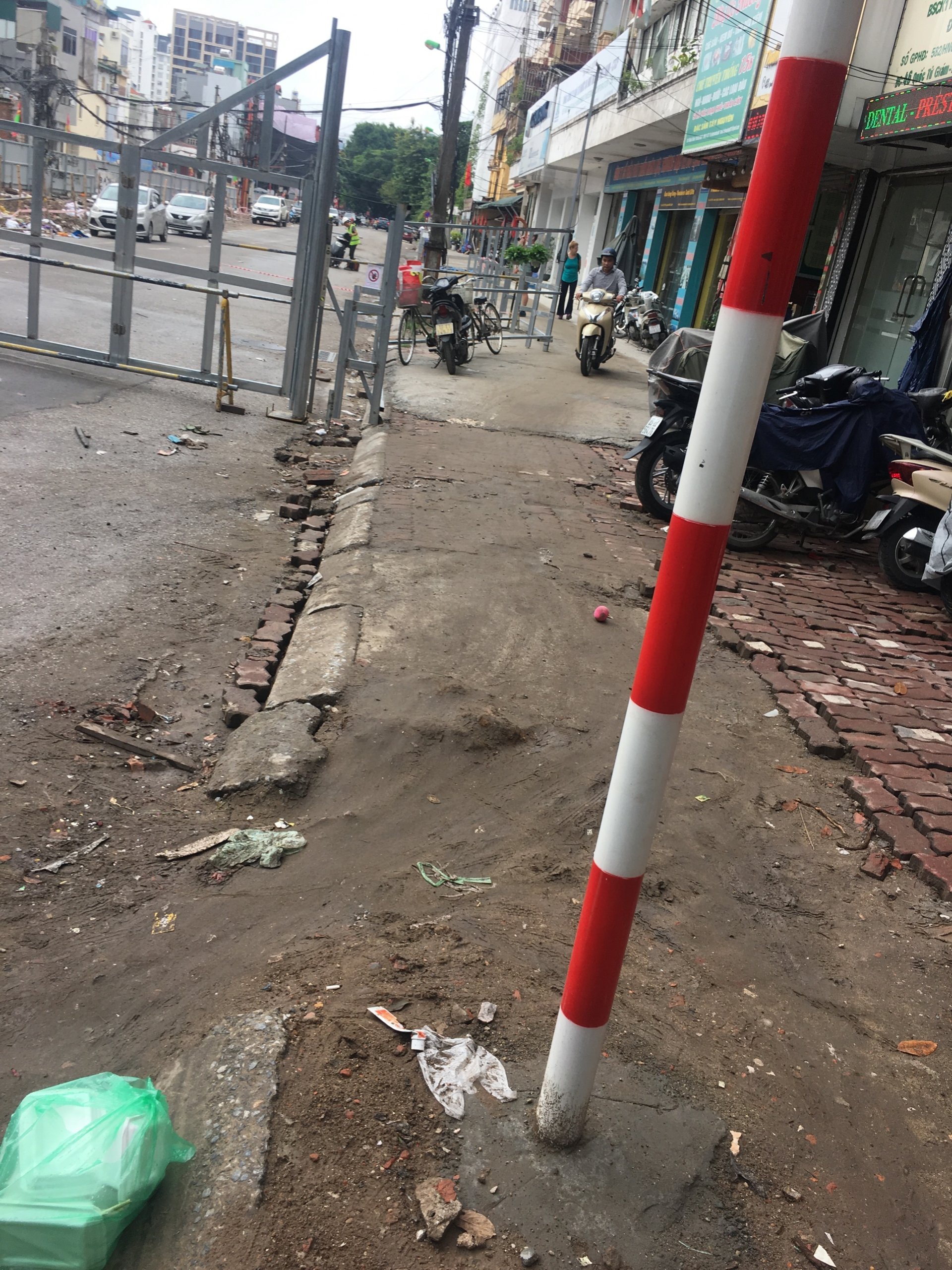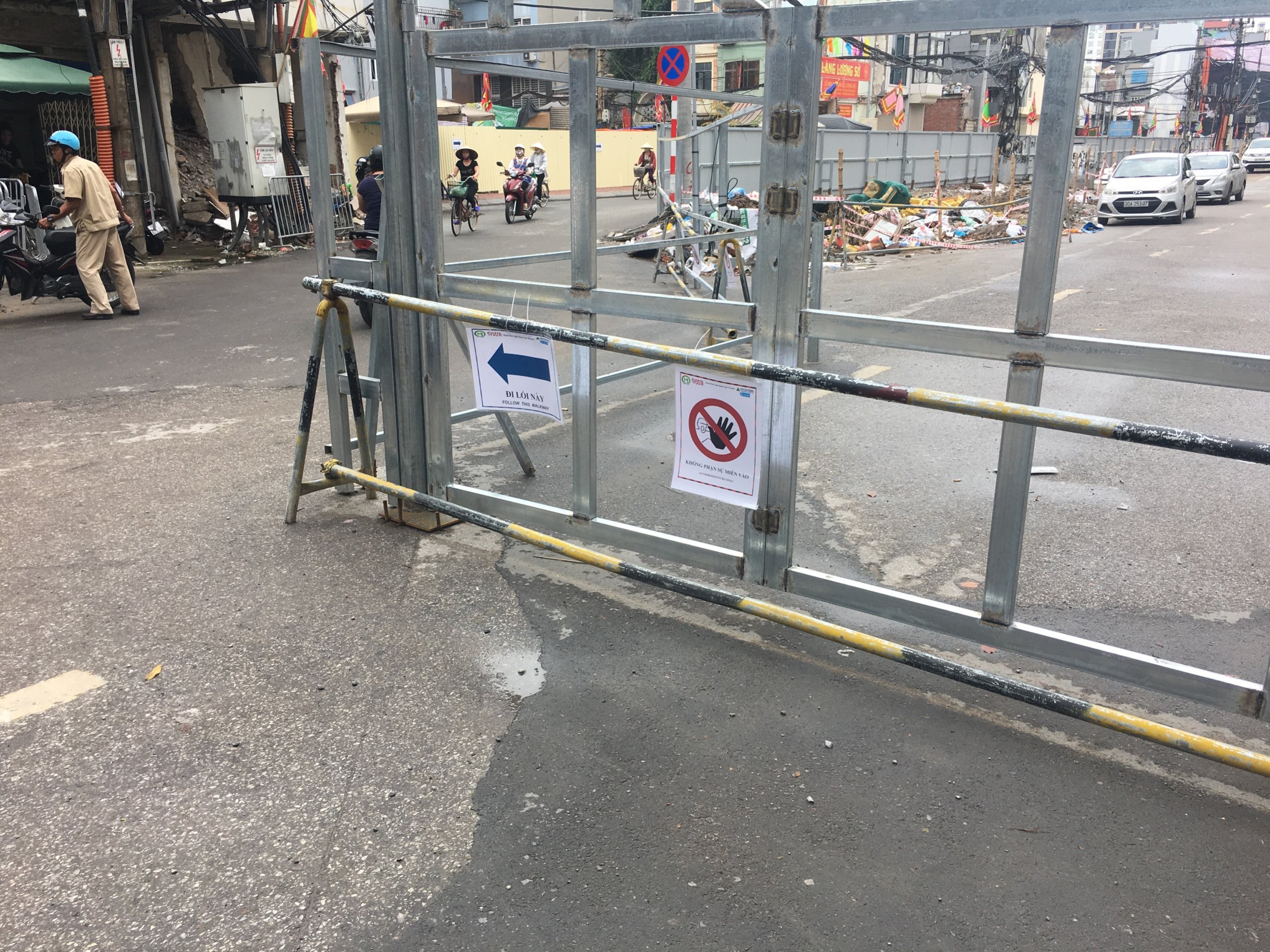 Một đoạn đường nhỏ khu vực rào dành cho cán bộ, đơn vị thị công đi vào nhưng vẫn còn một số người tham gia giao thông qua lại trên con đường này.