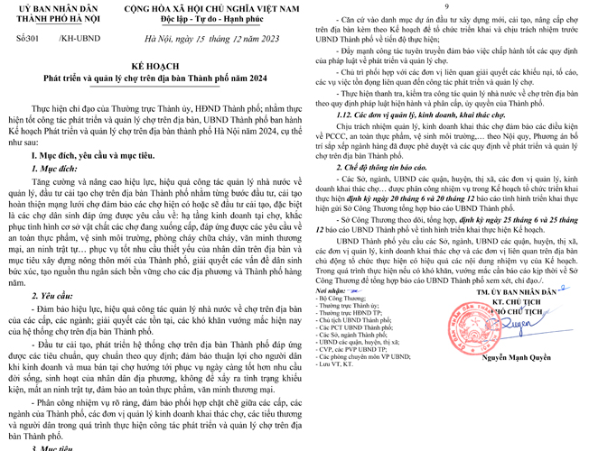 Nhằm tăng cường hiệu quả công tác quản lý Nhà nước, hoàn thiện mạng lưới chợ trên địa bàn, ngày 15/12/2023, UBND thành phố Hà Nội ban hành Kế hoạch 301/KH-UBND về phát triển và quản lý chợ trên địa bàn Thành phố năm 2024.