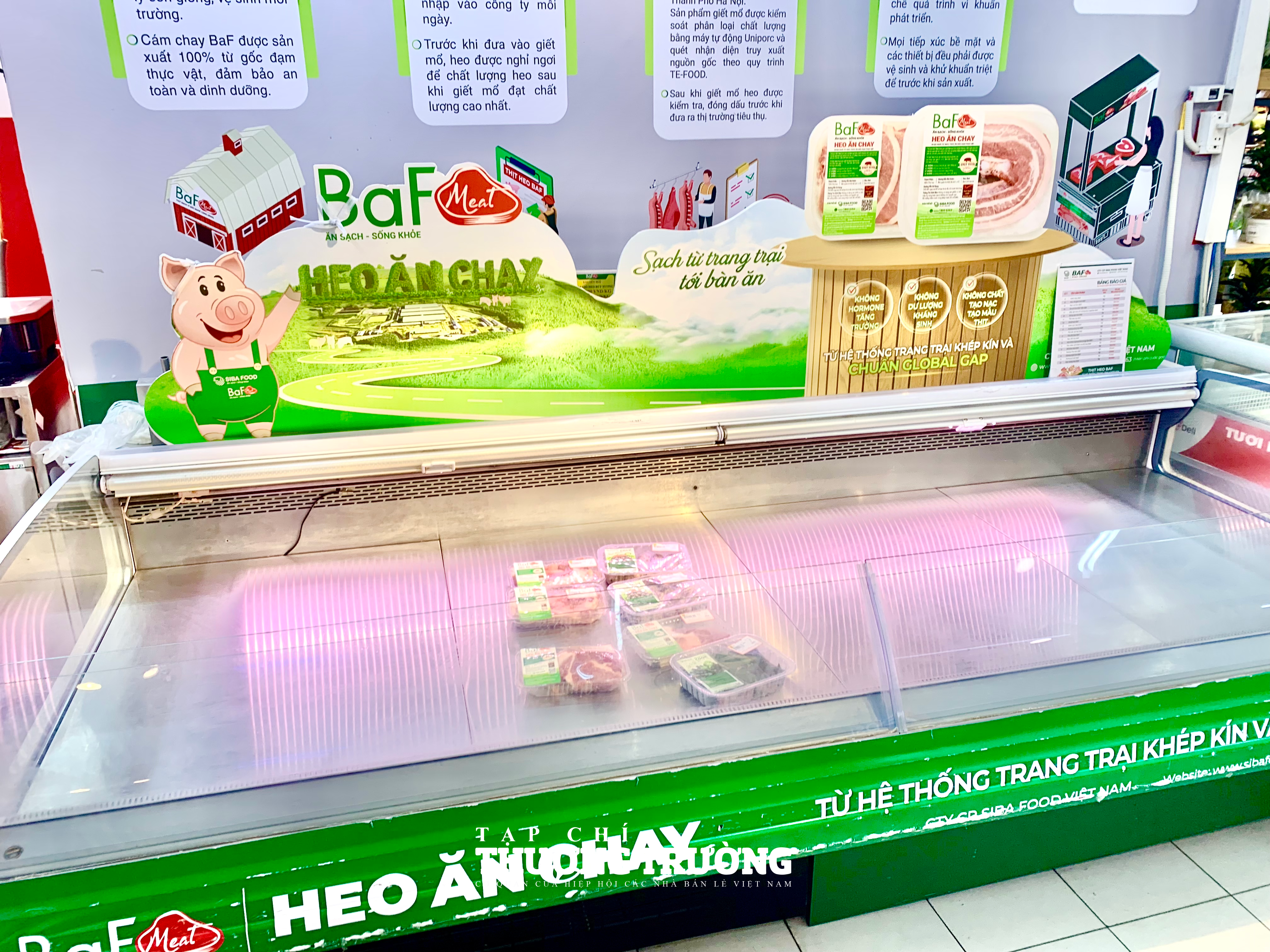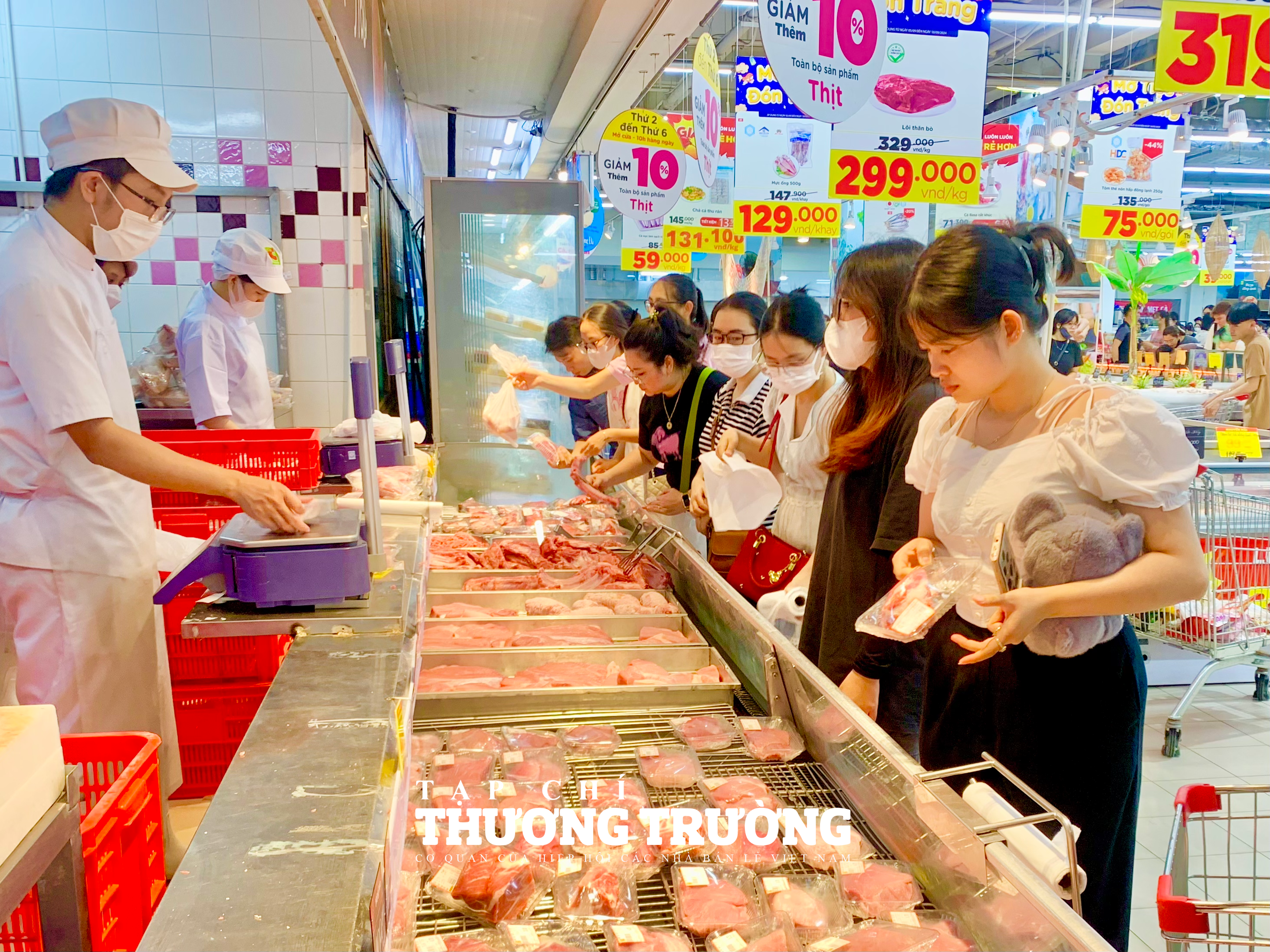 Quầy thịt cũng chật ních người đến mua sắm, tuy nhiên giá được giữ bình ổn như ngày thường. Cụ thể thịt heo ba chỉ loại ngon đồng giá 130.000 đồng/kg, nạc vai 140.000 đồng/kg, cá chép 60.000 đồng/kg, cá trắm đen 100.000 đồng/kg.