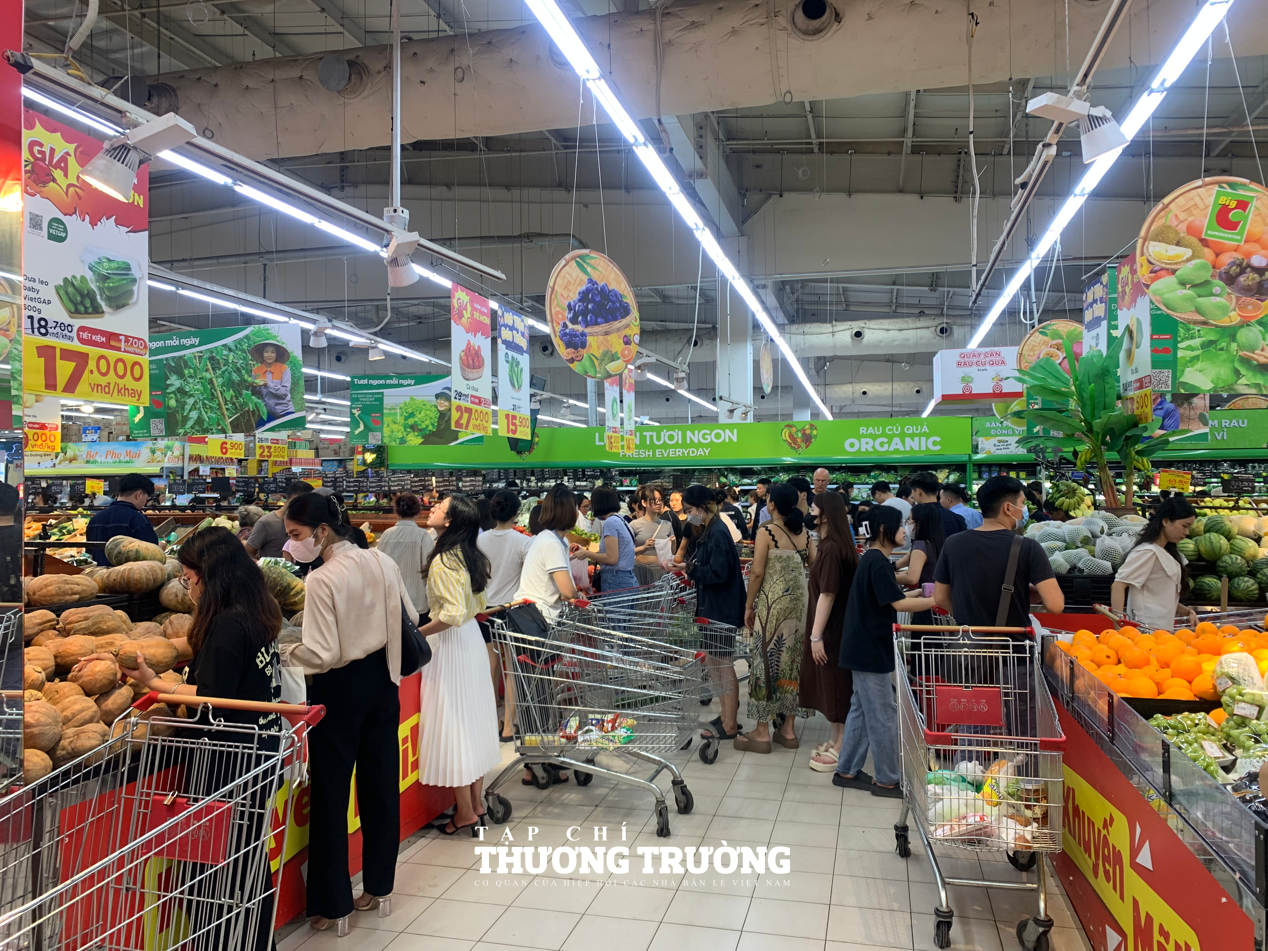 Một nhân viên phục vụ tại siêu thị cho biết, lượng người tới BigC để mua sắm đã tăng mạnh từ tối qua, đông nhất là khu vực bán rau củ quả, nhiều thời điểm quá tải, buộc nhân viên phải làm việc liên tục.