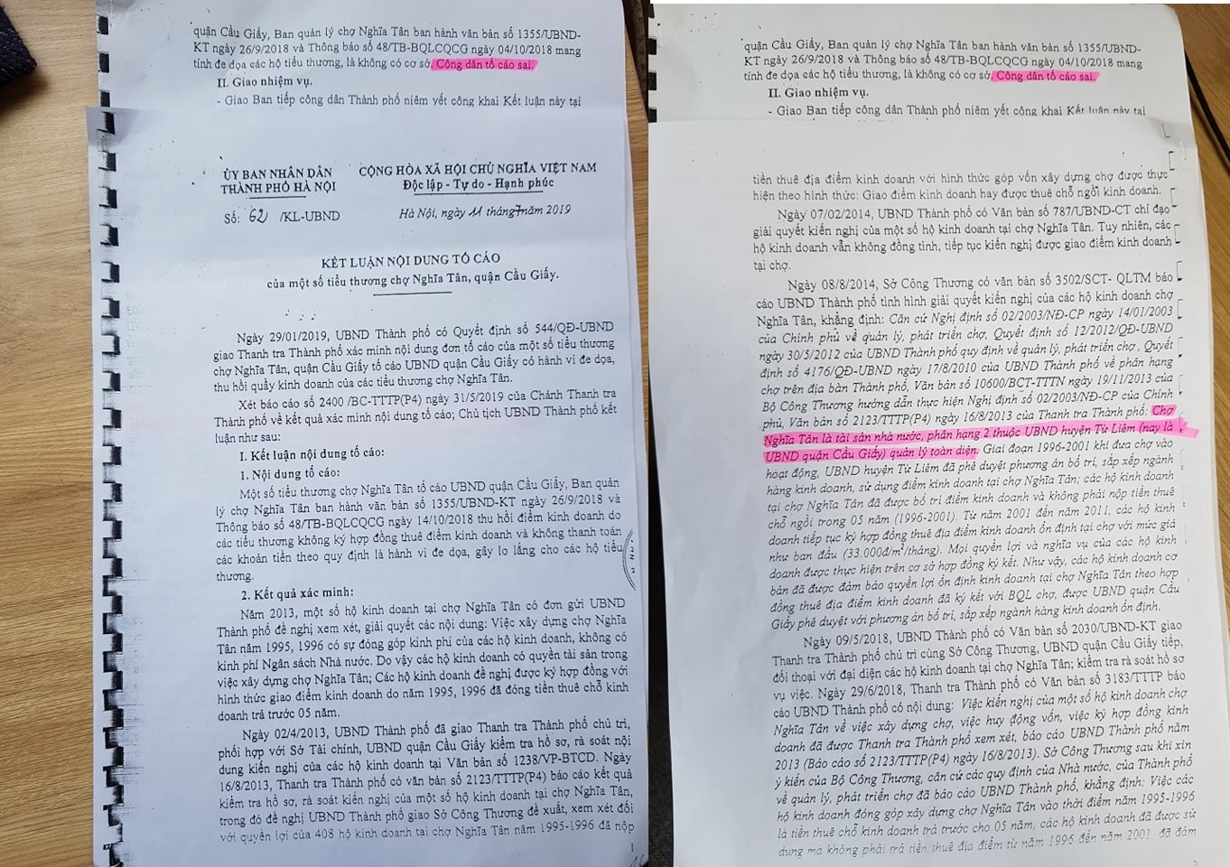 Cũng tại văn bản kết luận nội dung tố cáo số 62/KL-UBND ngày 11/7/2019, UBND TP khẳng định, chợ Nghĩa Tân là tài sản Nhà nước, được phân hạng 2, thuộc UBND quận Cầu Giấy quản lý toàn diện. Đây cũng là nội dung được thể hiện trong Văn bản số 3183/TTTP ngày 29/6/2018 do Chánh Thanh tra TP Hà Nội Nguyễn An Huy gửi UBND TP xung quanh những kiến nghị của các hộ kinh doanh tại chợ Nghĩa Tân.