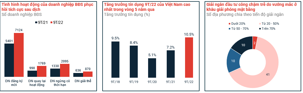 Bên cạnh đó, hoạt động của doanh nghiệp BĐS có cải thiện, trong 9 tháng đầu năm, lượng doanh nghiệp BĐS thành lập mới đạt 7.124 doanh nghiệp, tăng mạnh so với cùng kỳ. Lượng doanh nghiệp quay lại hoạt động là 1.769, cao hơn con số 998 so với cùng kỳ 2021. Vốn giải ngân đầu tư công dù chậm hơn so với kế hoạch nhưng vẫn đang được đẩy nhanh. Tuy nhiên tăng trưởng tín dụng hiện ở mức cao và tốc độ giải ngân công vẫn chậm so với chỉ tiêu đề ra.