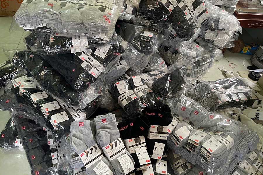 Hàng nghìn đôi tất có dấu hiệu giả mạo nhãn hiệu đang được bảo hộ tại Việt Nam là NIKE, UNIQLO. Ảnh: Đội QLTT số 25