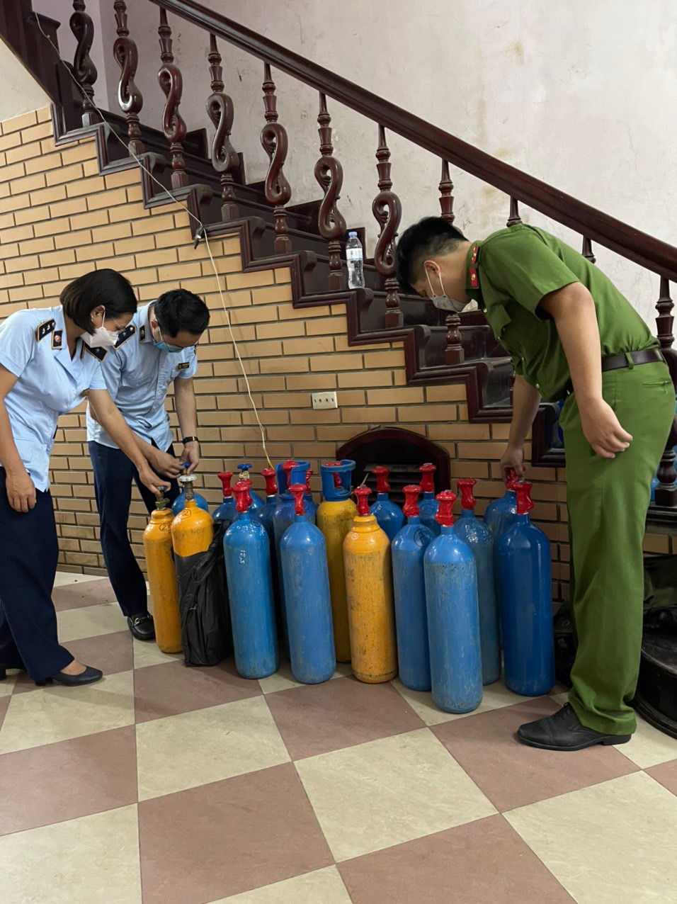 Trước đó, ngày 26/8, Đội QLTT số 9 (Cục QLTT Hà Nội) phối hợp với Đội Cảnh sát kinh tế, Công an quận Tây Hồ đột xuất kiểm tra điểm tập kết hàng hoá địa chỉ tại số 6, ngõ 76 đường An Dương, phường Yên Phụ, quận Tây Hồ (Hà Nội). Tại thời điểm kiểm tra, đoàn kiểm tra phát hiện tại địa chỉ trên đang tập kết lô hàng hoá gồm 22 bình kim loại (bên trong mỗi bình chứa từ 4 đến 4,5 kg khí N2O), trên vỏ bình không có thông tin về nơi sản xuất, xuất xứ.