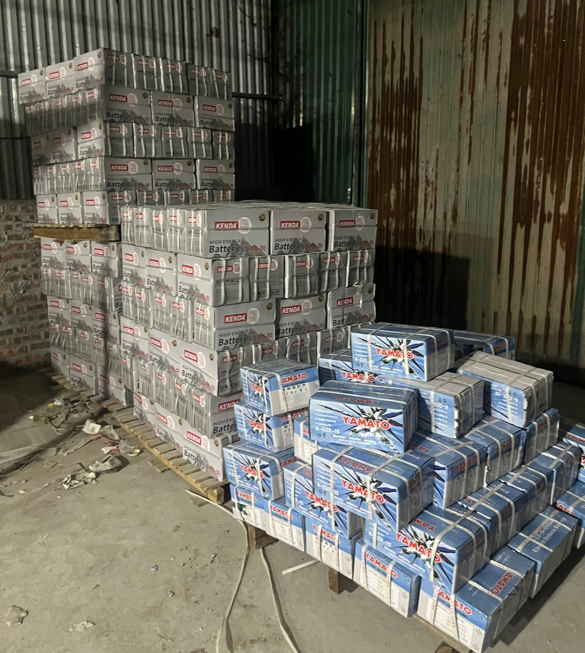 Bên cạnh đó, lực lượng chức năng cũng phát hiện và tạm giữ tại cơ sở trên 600 bình ắc quy nhãn hiệu Yamato, loại 12V (đóng trong 150 thùng cát tông, 4 chiếc/thùng); 1.800 chiếc bình ắc quy nhãn hiệu Kijo, loại 12V 6GFM-15 (đóng trong 450 thùng cát tông, 4 chiếc/thùng); 600 chiếc bình ắc quy CR7 loại 6-FD-30 (đóng trong 150 thùng cát tông, 4 chiếc/thùng); 900 chiếc bình ắc quy nhãn hiệu Kenda loại 48V-30Ah (đóng trong 225 thùng cát tông, 4 chiếc/thùng); 160 chiếc bình ắc quy nhãn hiệu amato loại 6-DPB-15 (đóng trong 40 thùng cát tông, 4 chiếc/thùng).