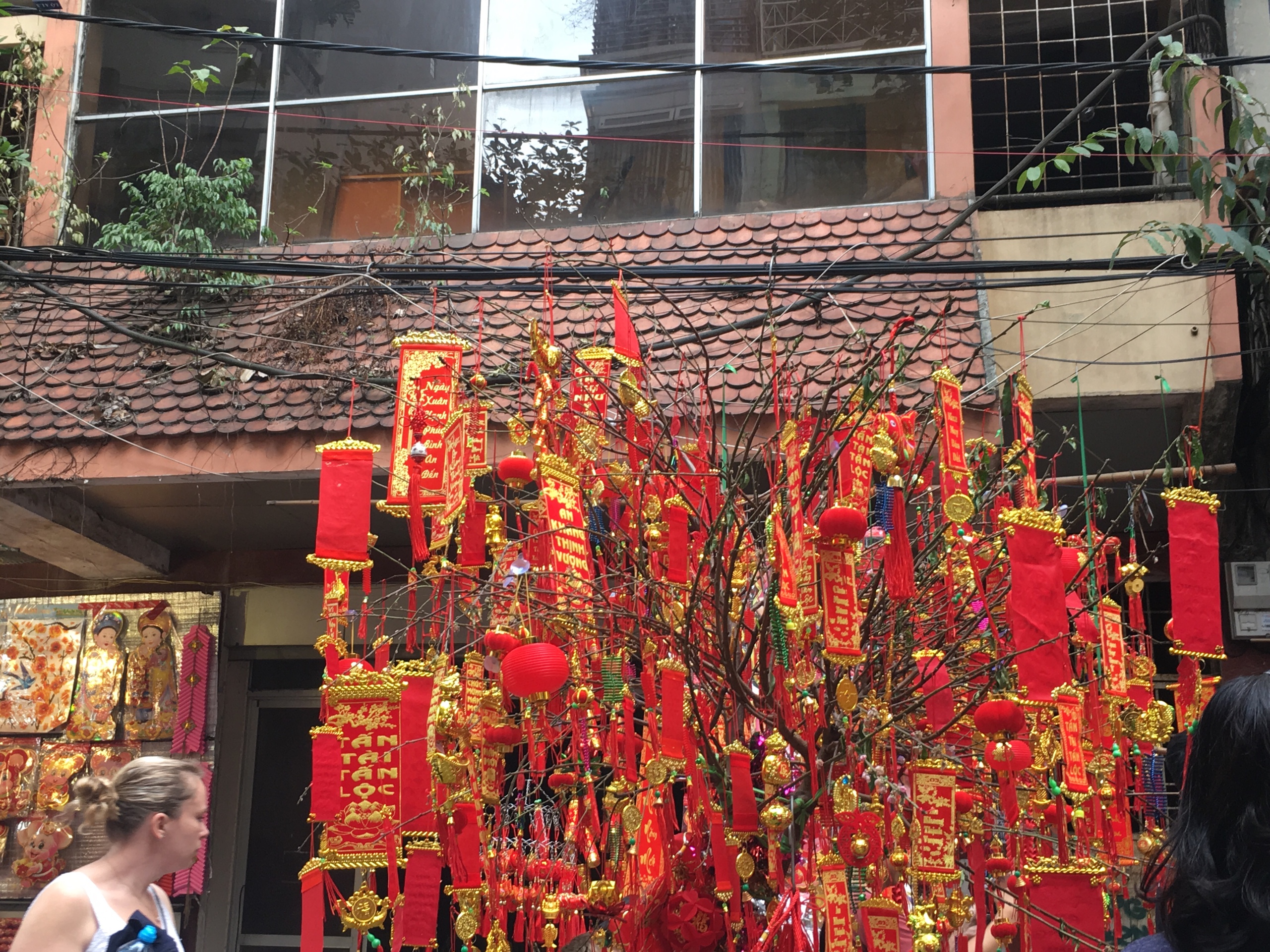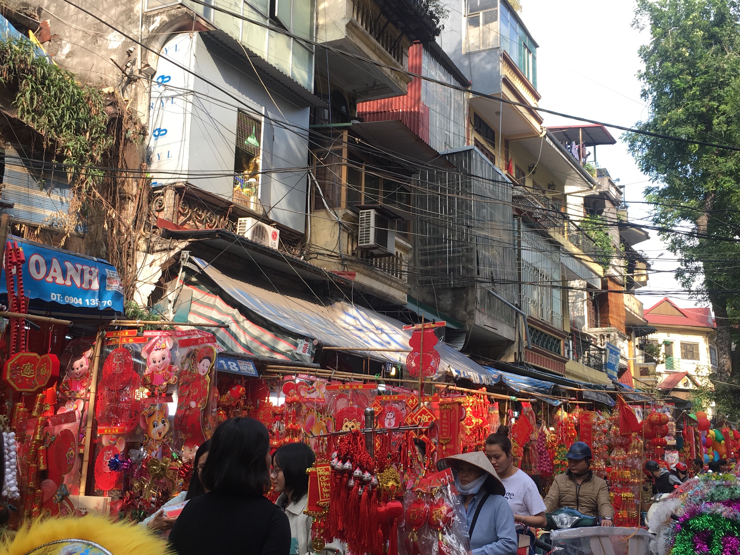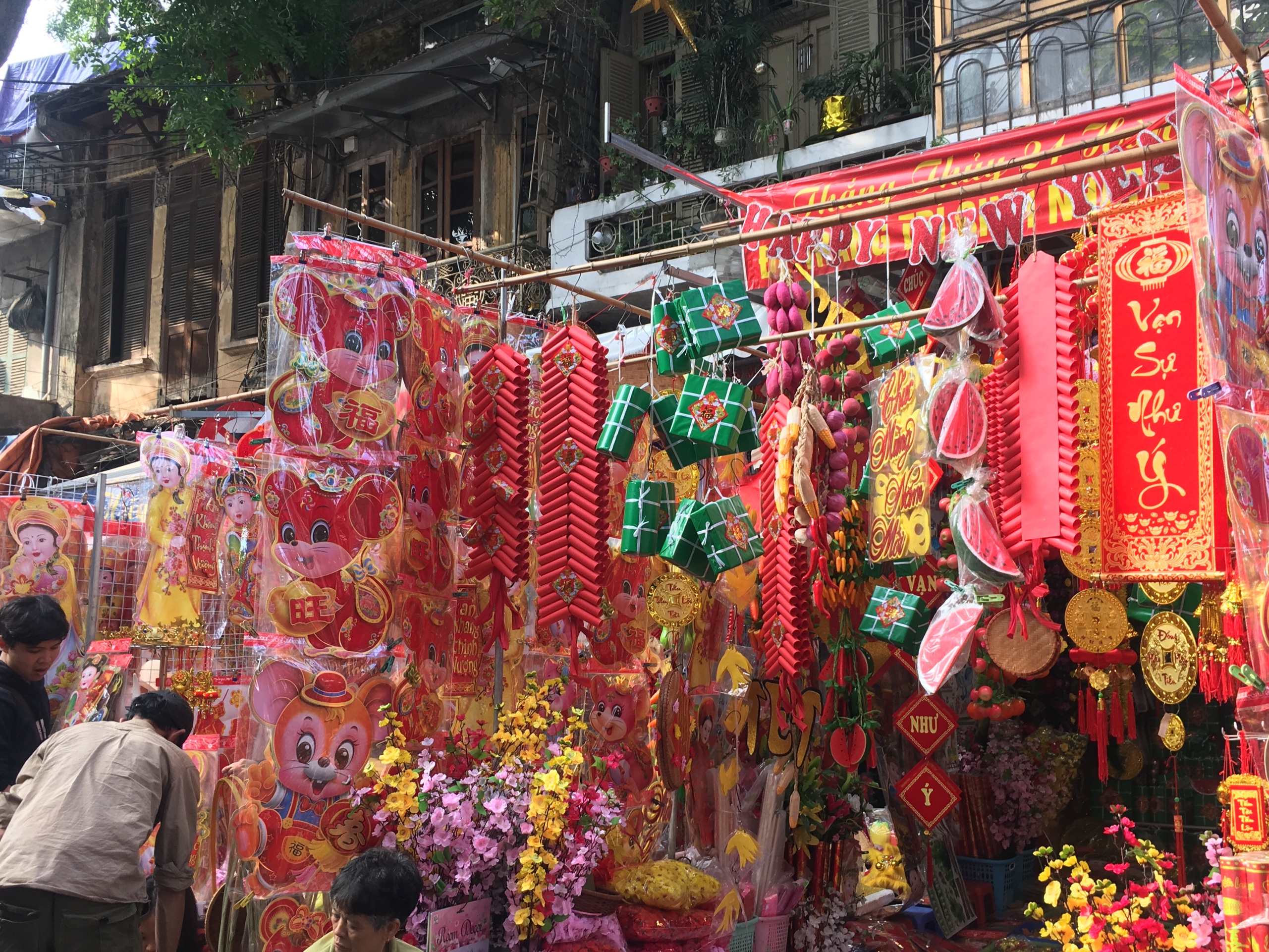 Phố Hàng Mã lúc này ngập tràn bánh chưng giấy, pháo điện đỏ lấp lánh, câu đối,....làm cho con phố này trở nên đỏ rực.