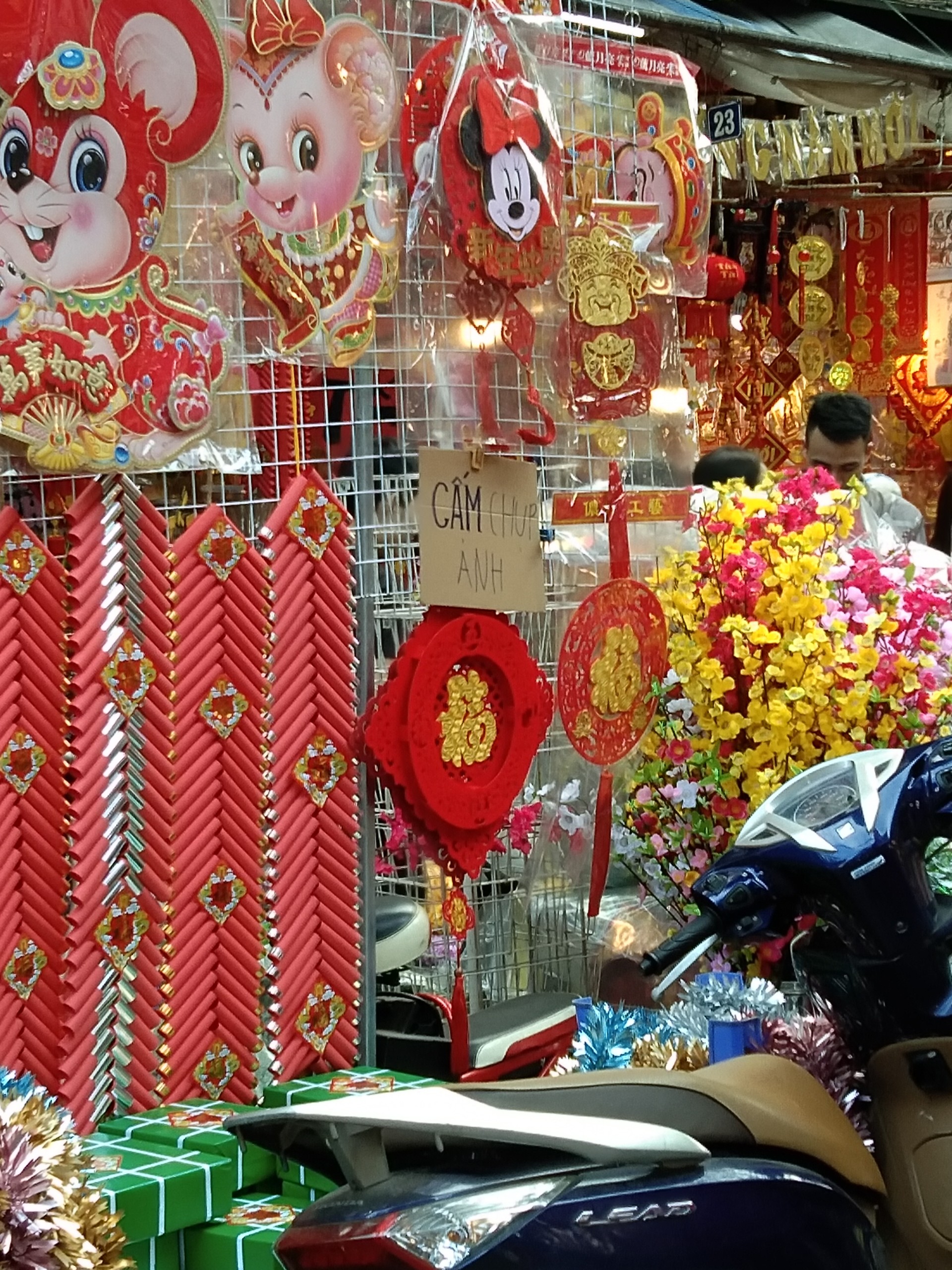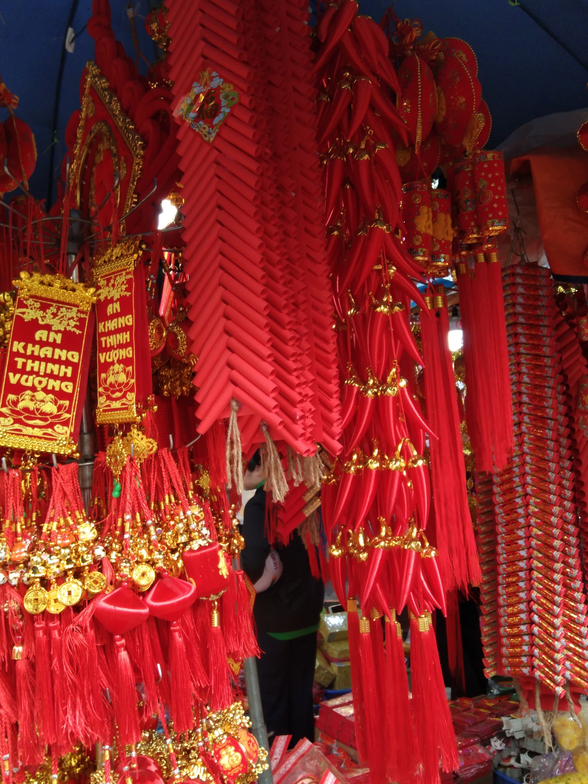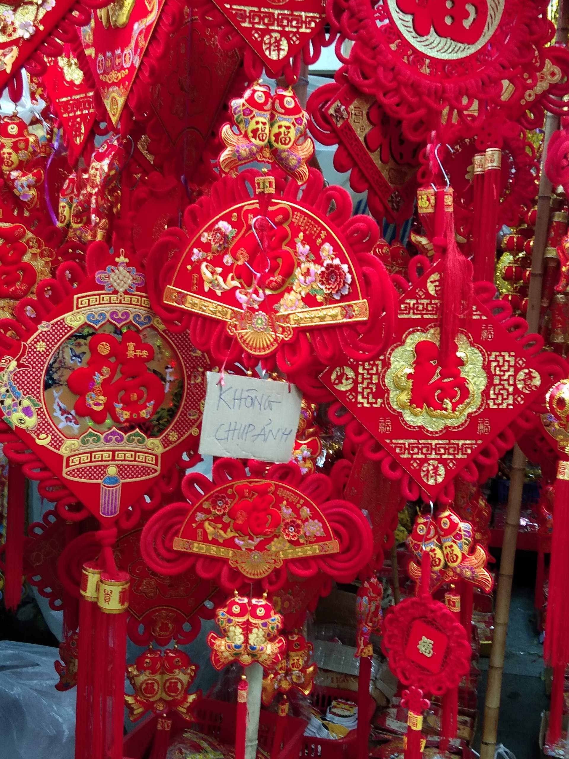 Các câu đối chứa những lời "Chúc mừng năm mới", "An khang thịnh vượng",...hay những con lắc, pháo giấy, quả ớt,...đều nhuộm đỏ và có thể chạy bằng điện sáng lấp lánh.