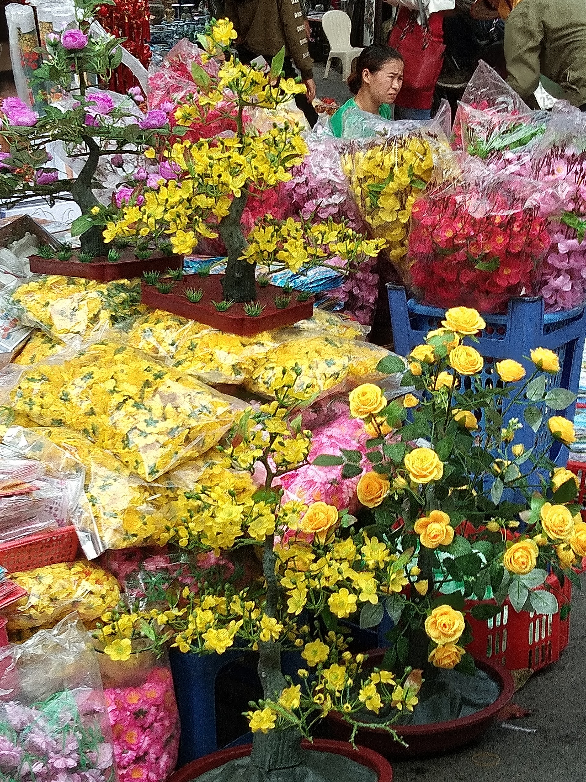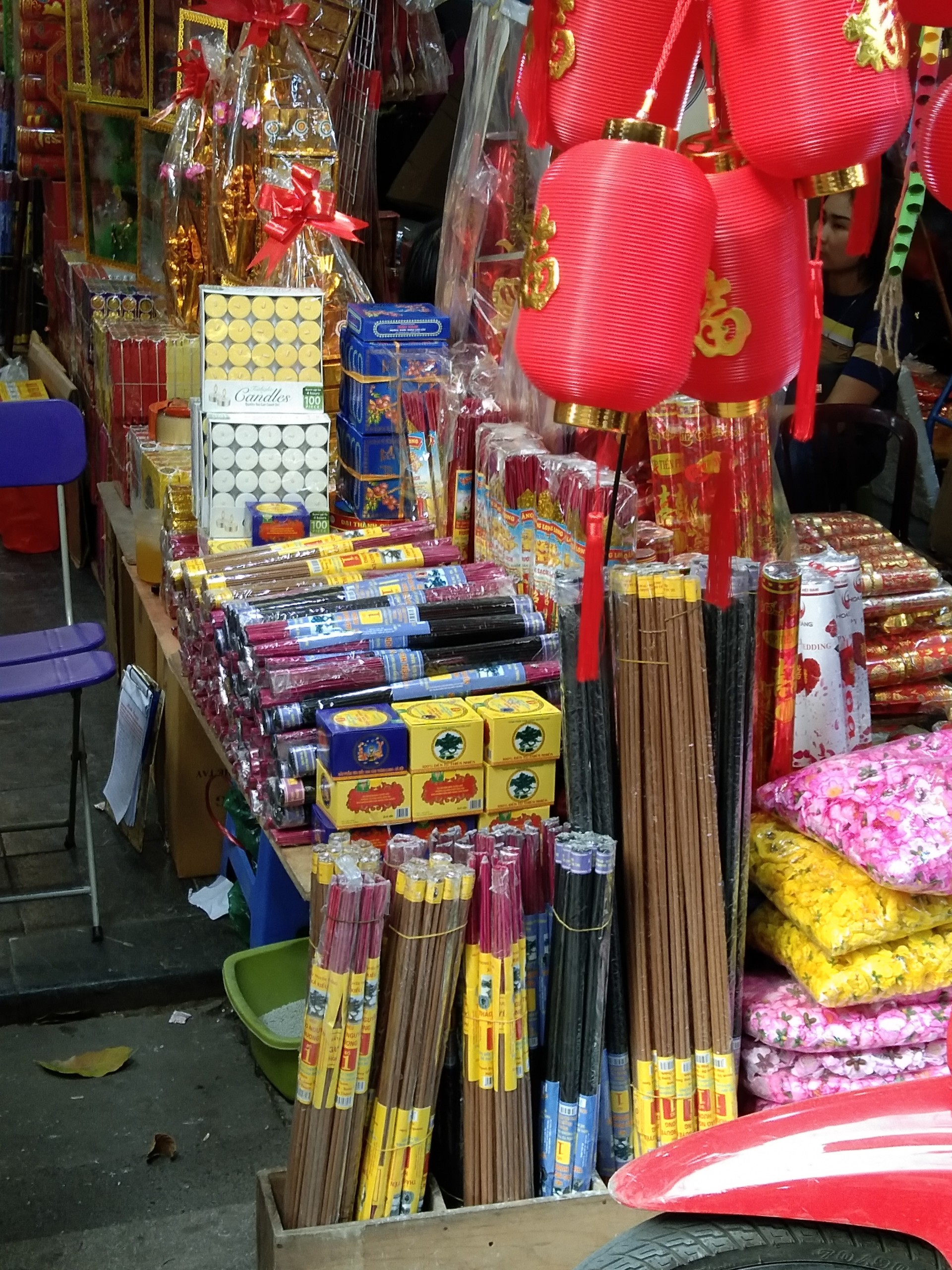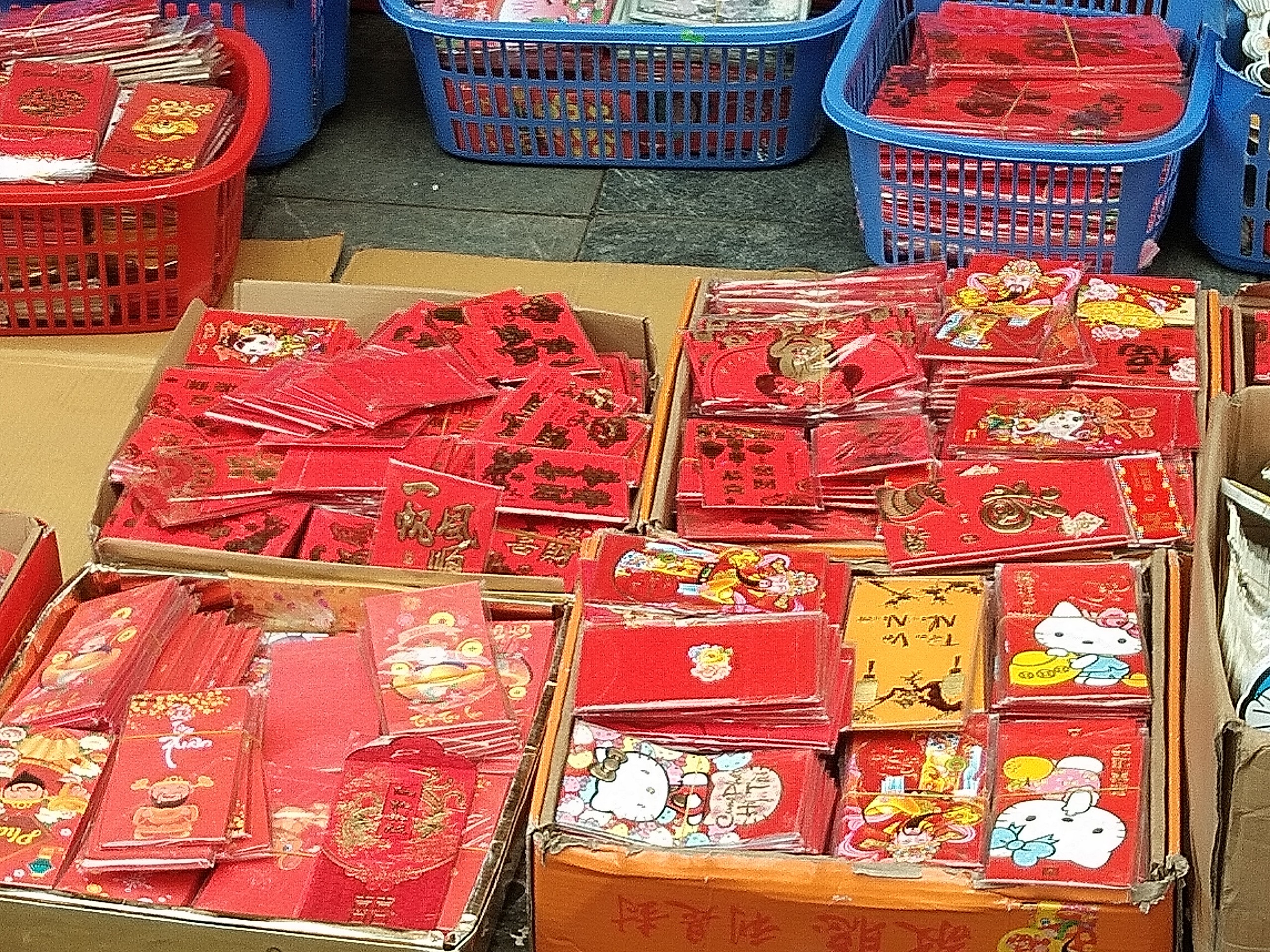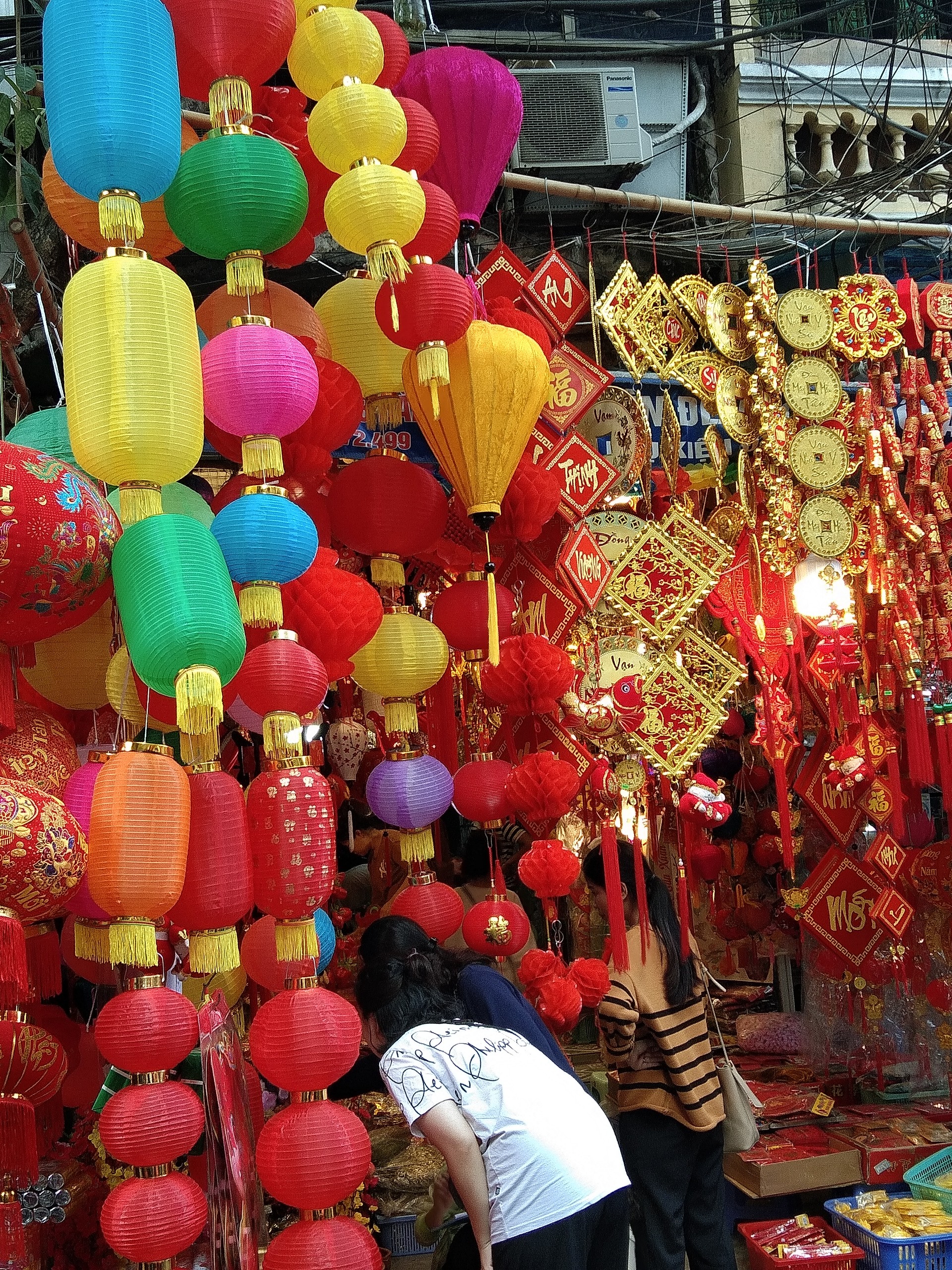 Các câu đối chứa những lời "Chúc mừng năm mới", "An khang thịnh vượng",...hay những con lắc, pháo giấy, quả ớt,...đều nhuộm đỏ và có thể chạy bằng điện sáng lấp lánh.