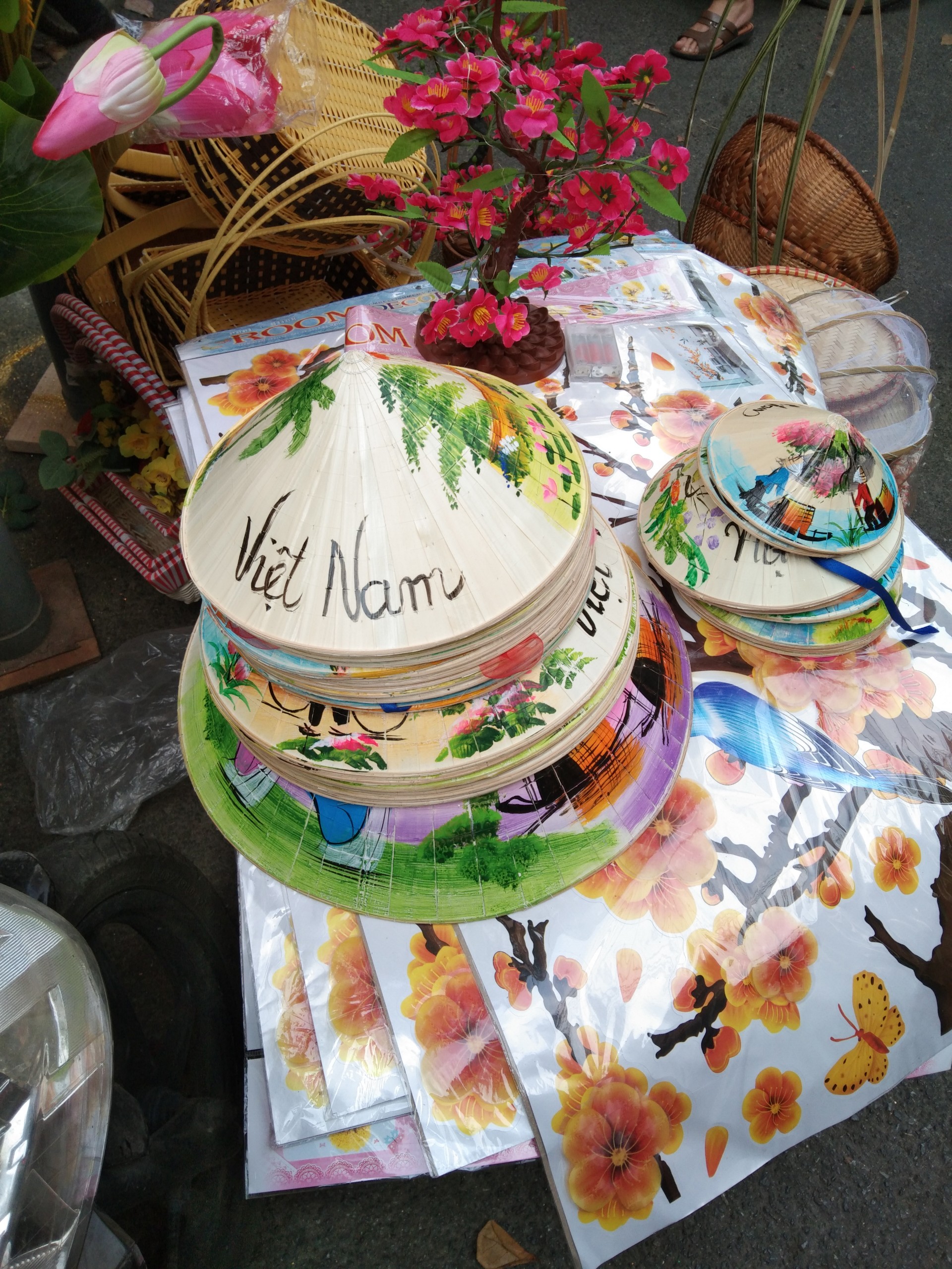 Rất nhiều sản phẩm mang đậm truyền thống những ngày Tết của người Việt Nam. Những chiếc nón lá khá xinh xắn với những họa tiết về hình ảnh quê hương, đất nước, con người Việt Nam nổi bật tại một góc phố.