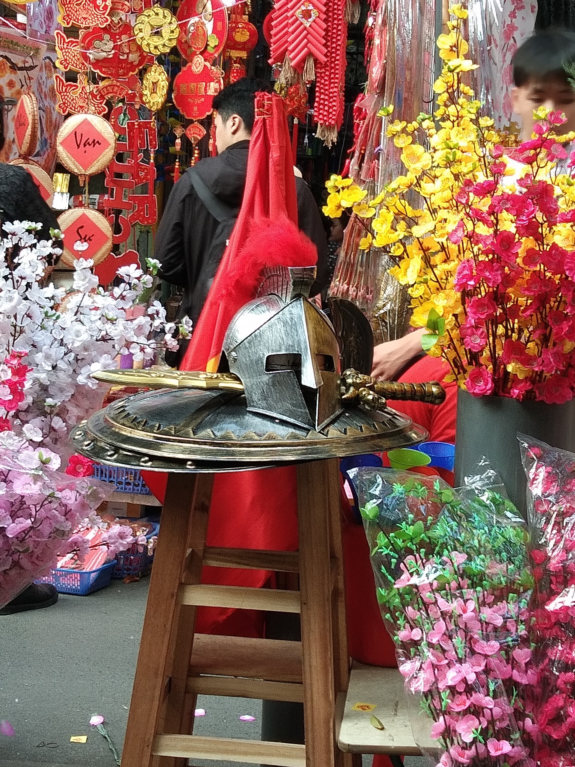 Mặc dù chủ yếu là các mặt hàng truyền thống phục vụ nhu cầu mua sắm dịp Tết. Thế nhưng, tại một số gian hàng, vẫn còn nhiều đồ chơi bạo lực như mũ sắt, kiếm, khiên,...bày bán giữa phố.
