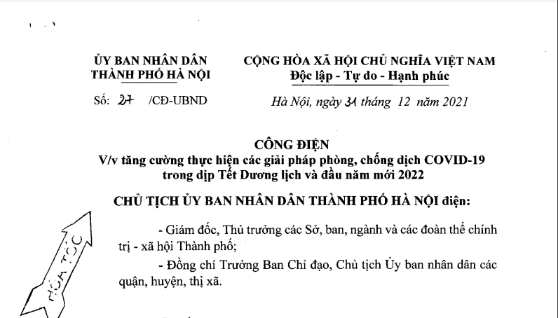 Công điện hỏa tốc số 27/CĐ-UBND ngày 31/12/2021 của UBND thành phố Hà Nội