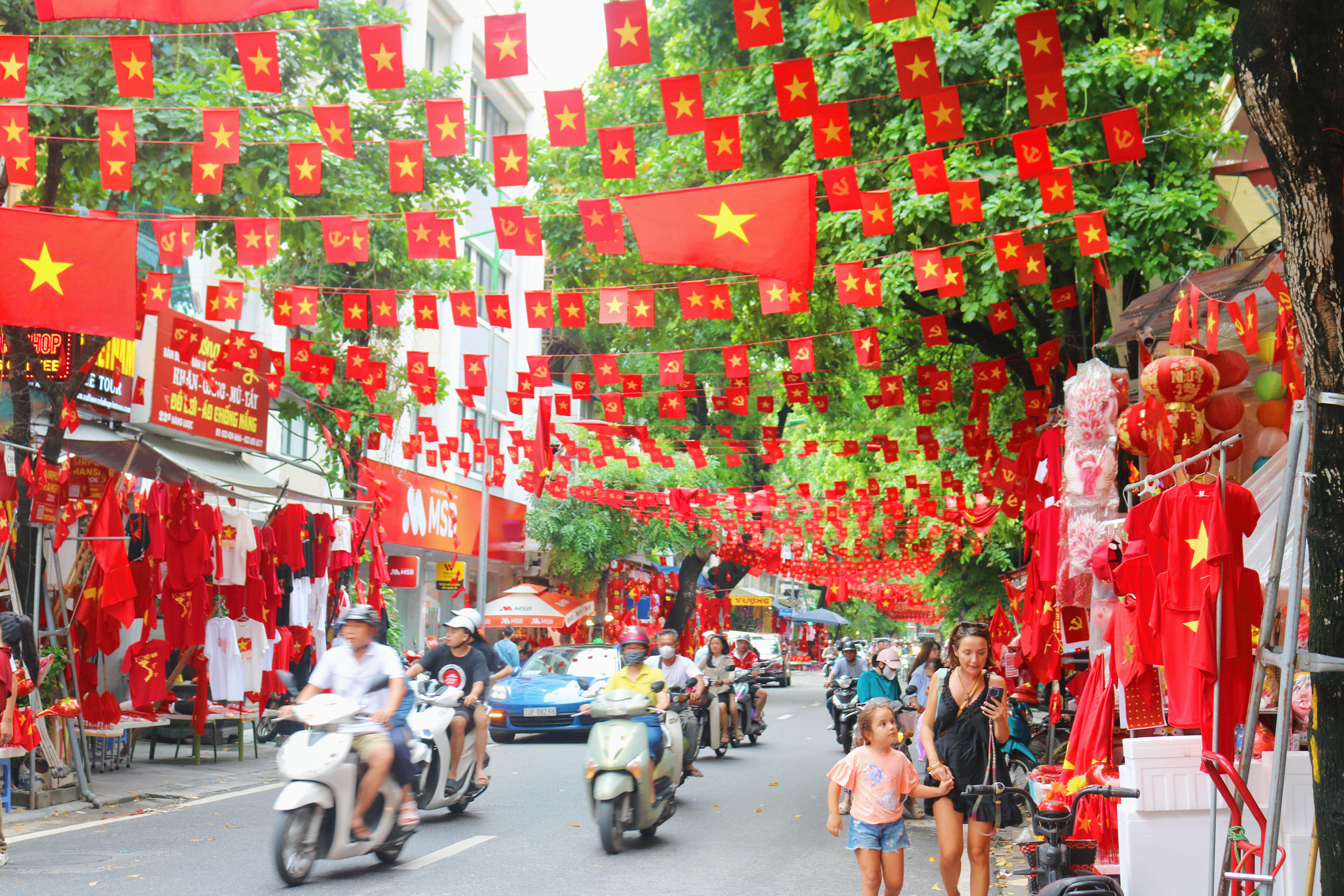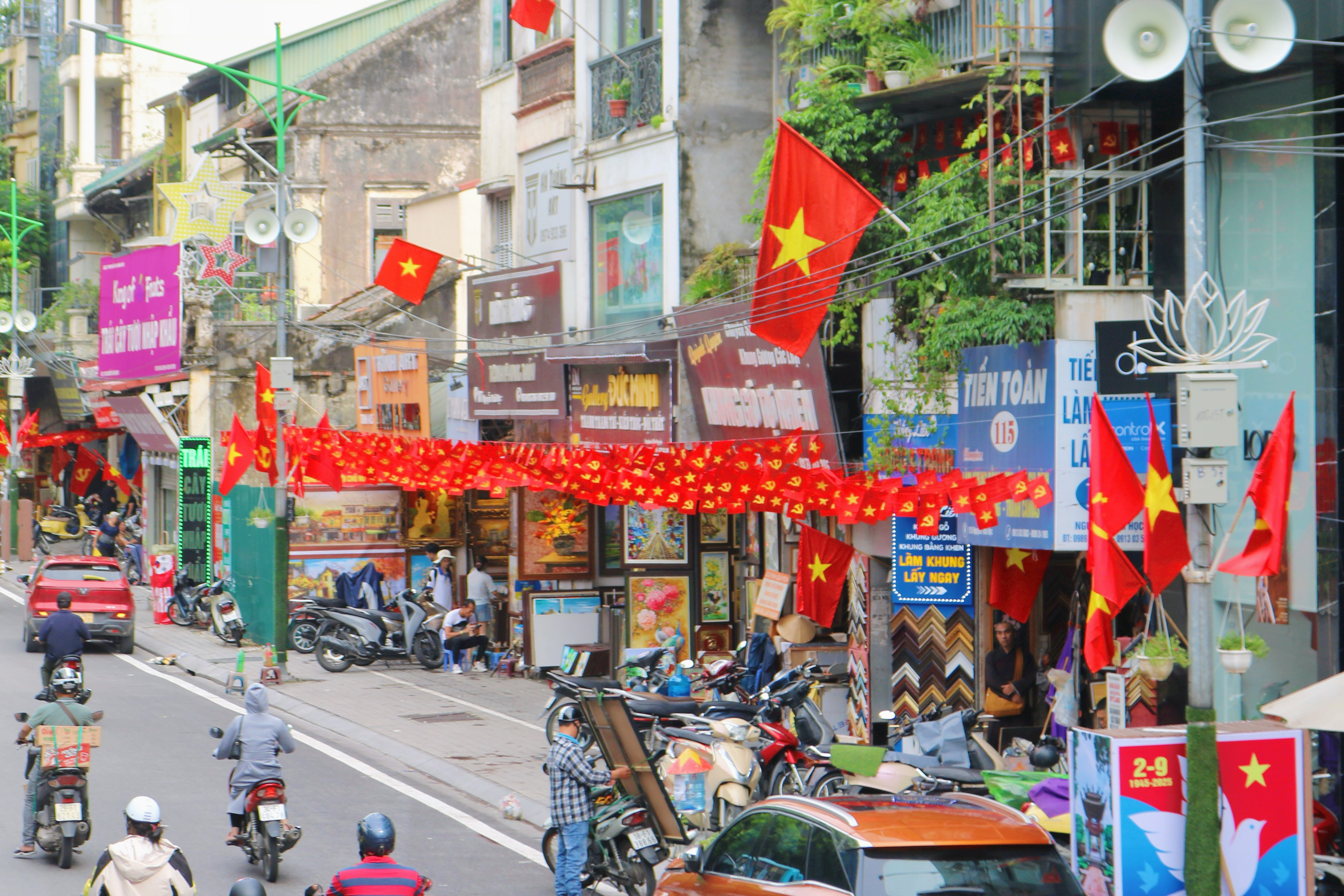Tại ngã tư Hàng Mã – Hàng Lược, những lá cờ đỏ sao vàng chen nhau phủ kín, dệt nên tấm thảm rực rỡ như bức tranh sống động của lòng yêu nước. (Ảnh: Mai Lan)