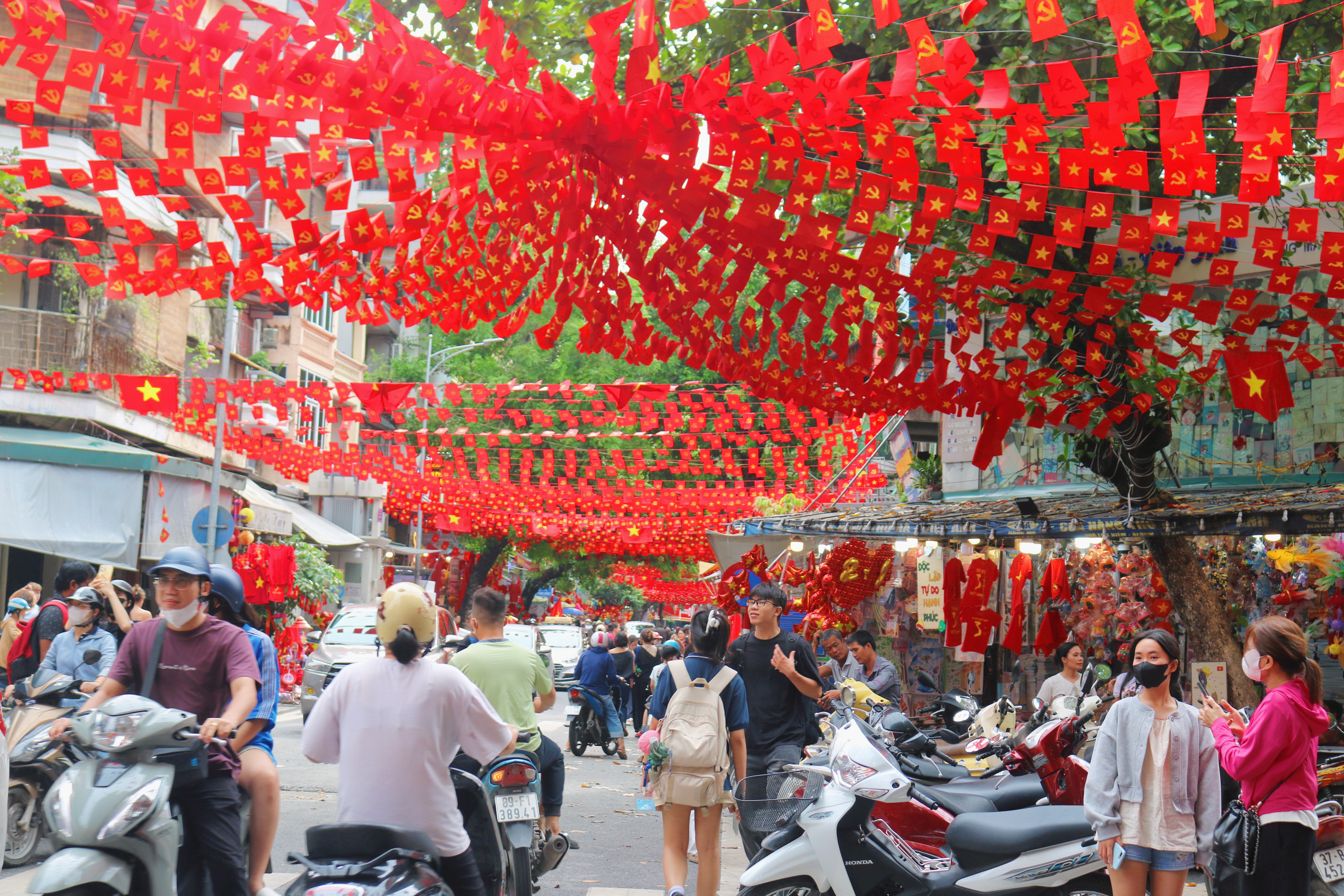 Hàng nghìn lá cờ đỏ sao vàng tung bay trong gió, tạo nên khung cảnh rực rỡ khiến bất kỳ ai ngang qua cũng dừng lại chiêm ngưỡng.(Ảnh: Mai Lan)