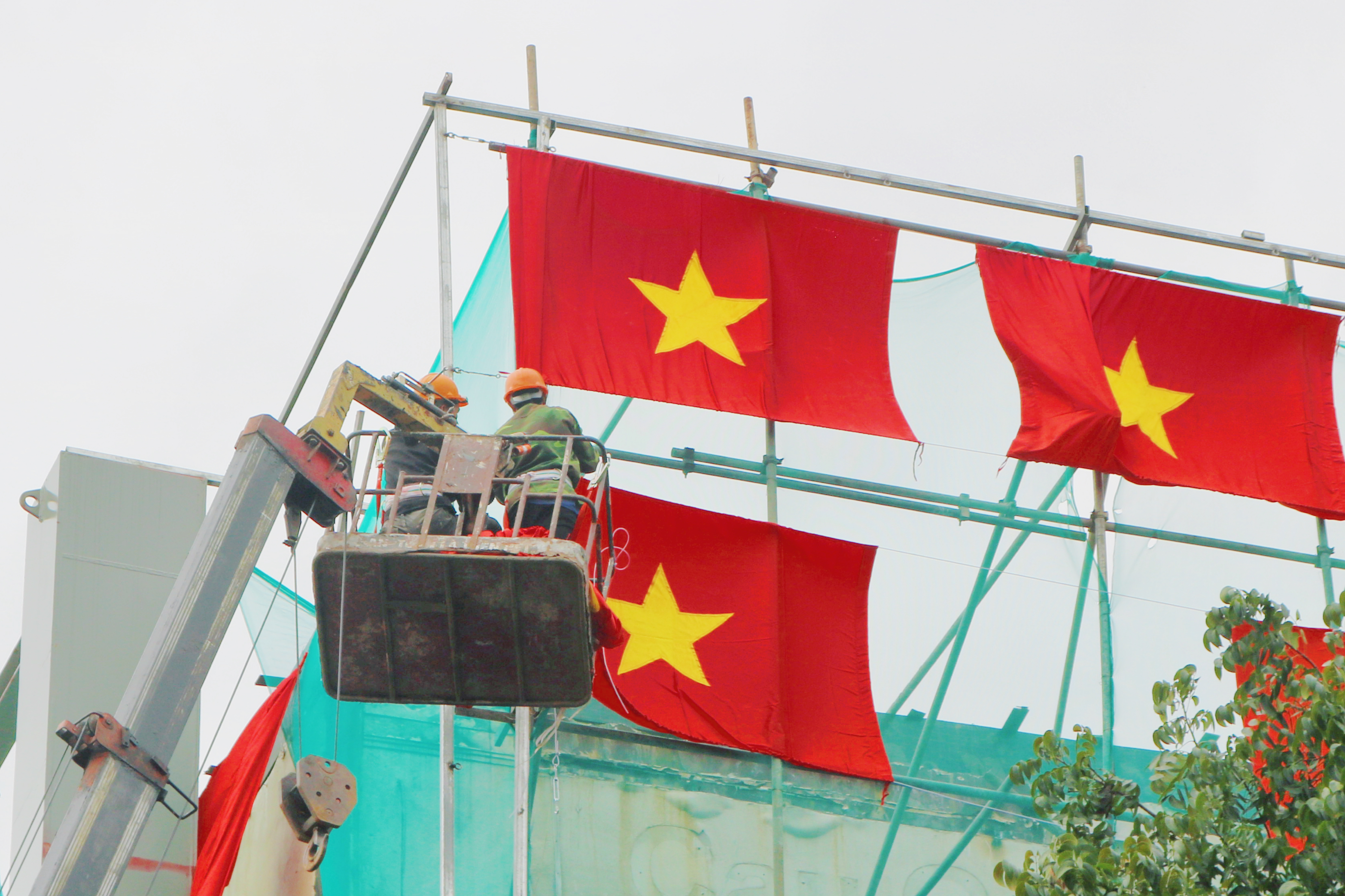Nhóm công nhân xây dựng trong trang phục bảo hộ cùng nhau treo lá cờ Tổ quốc trên giàn giáo, lan toả tinh thần hân hoan cùng nhau hướng tới ngày Quốc khánh. (Ảnh: Mai Lan)