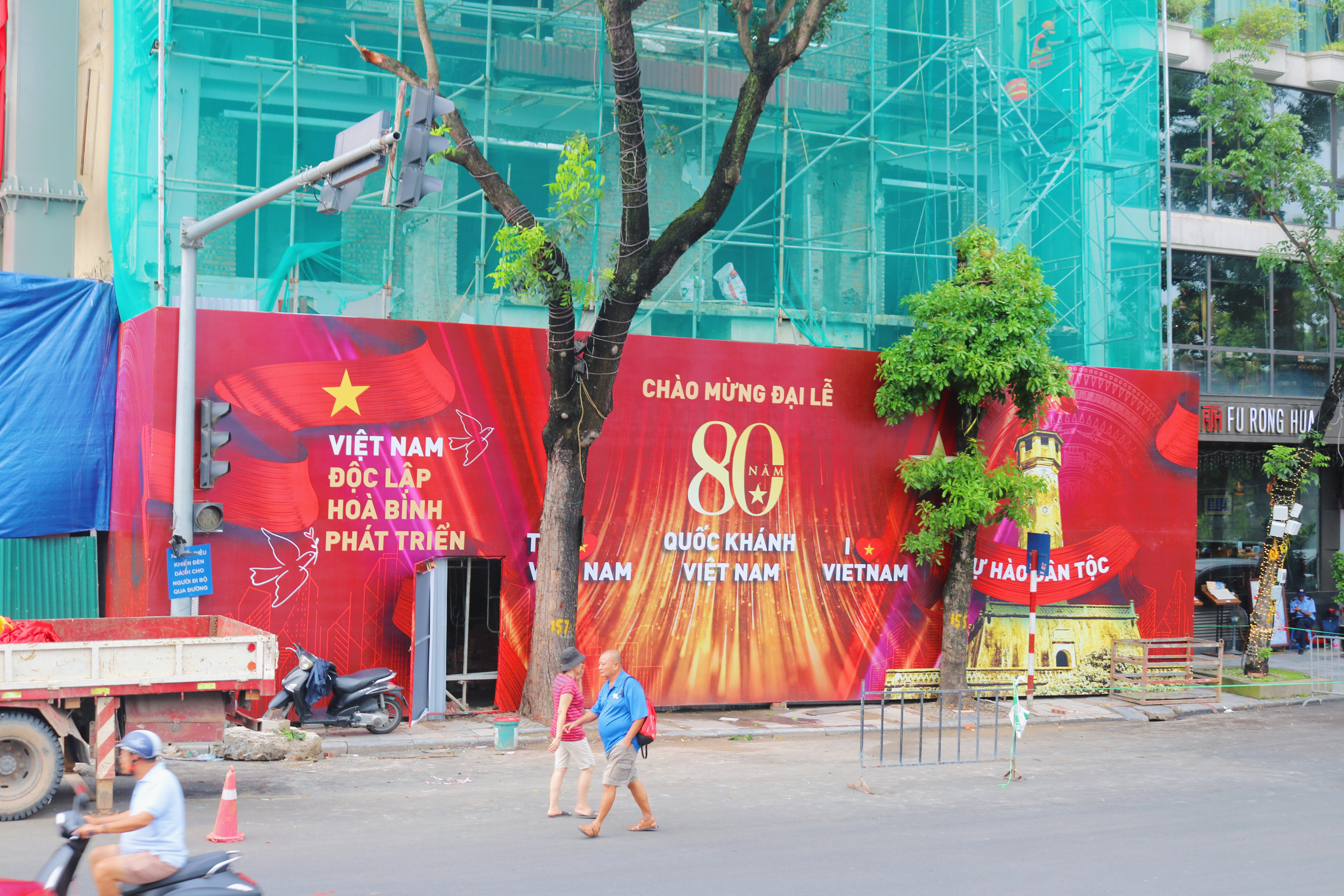 Những tấm pano lớn chào mừng kỷ niệm 80 năm Cách mạng Tháng Tám thành công và Quốc khánh 2/9 được dựng tại nhiều khu vực trung tâm. (Ảnh: Mai Lan)