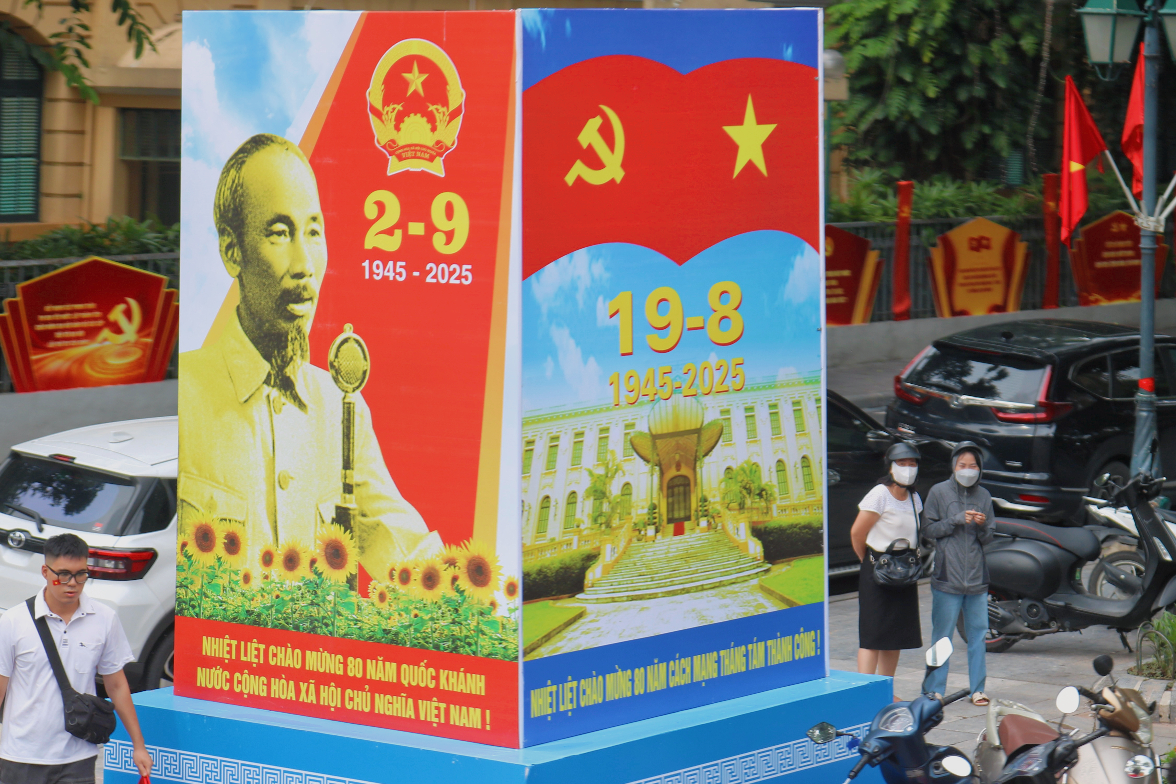 Nhiều cơ quan trang hoàng pano, áp phích với khẩu hiệu: “Nhiệt liệt chào mừng 80 năm Cách mạng Tháng Tám thành công (19/8/1945-19/8/2025) và Quốc khánh nước Cộng hoà xã hội chủ nghĩa Việt Nam (2/9/1945-2/9/2025”. (Ảnh: Mai Lan)