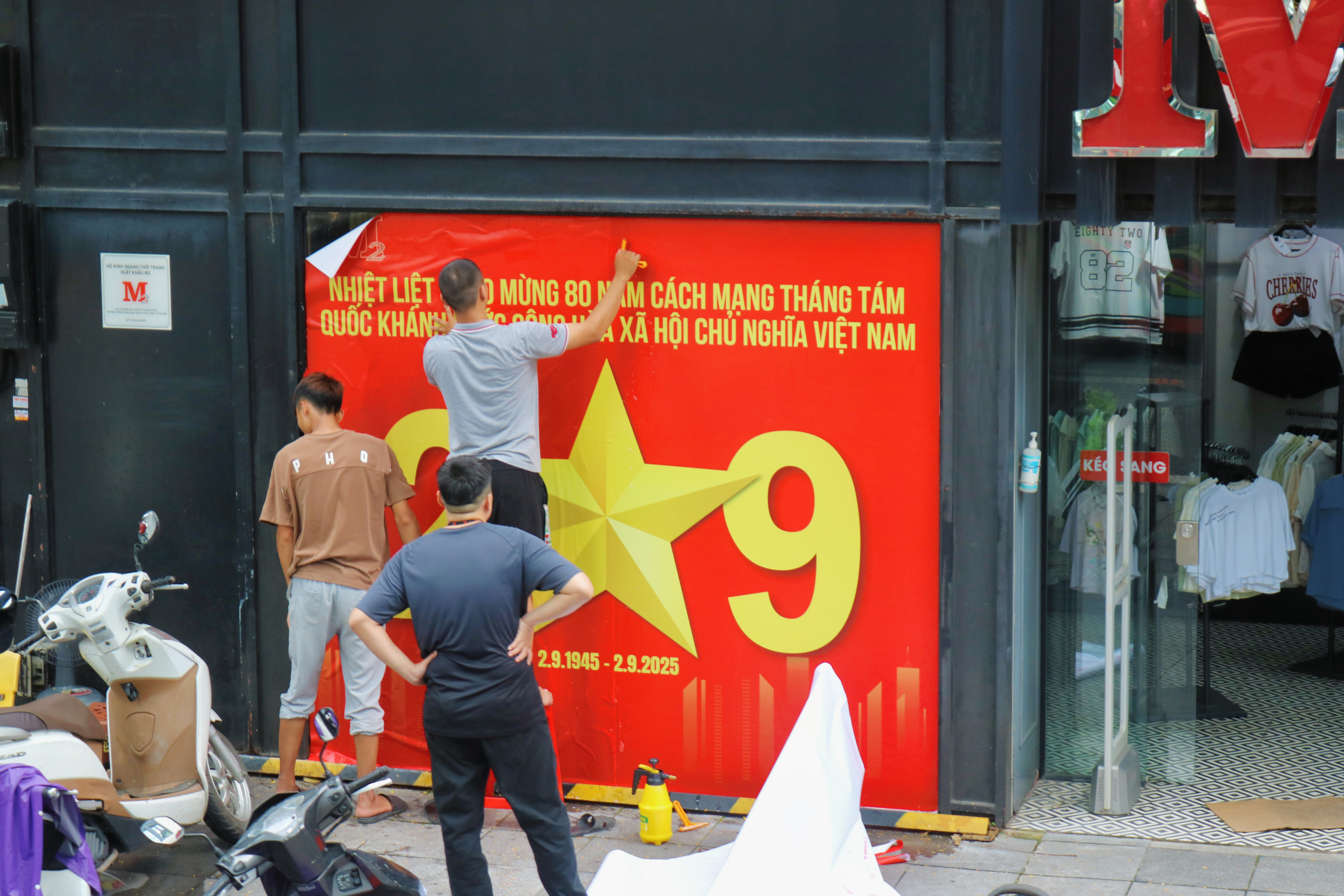 Những nhân viên tại một cửa hàng thời trang đang tất bật dán poster kỷ niệm Quốc khánh 2/9 lan tỏa sắc đỏ tự hào đến từng góc phố. (Ảnh: Mai Lan)