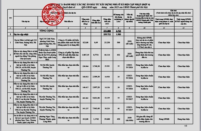 Danh mục các dự án đầu tư xây dựng nhà ở xã hội cập nhật đợt 4 năm 2025 của UBND TP Hà Nội.
