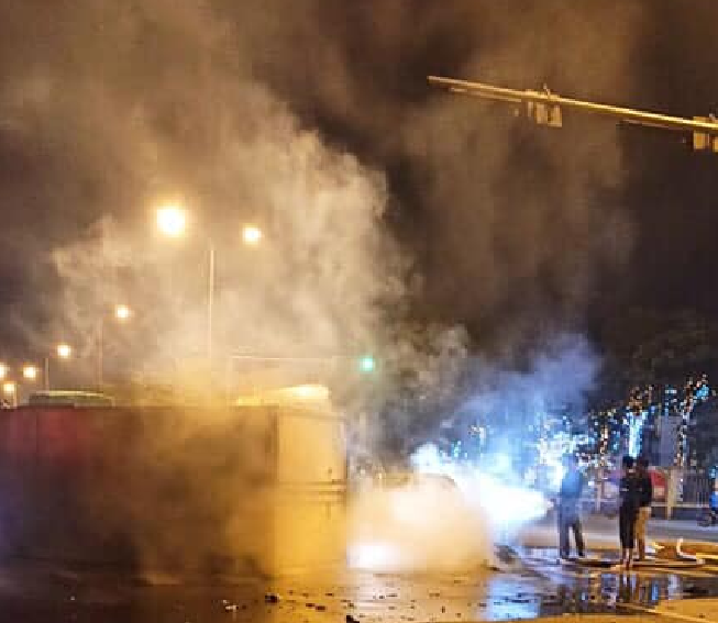Cú tông mạnh khiến xe tải lật ngang, ôtô con bốc cháy. Ngọn lửa bùng lên nhanh, thiêu rụi một phần đầu ôtô. Sau tai nạn, hai ôtô nằm chắn hoàn toàn quốc lộ 5 hướng đi Hải Phòng.