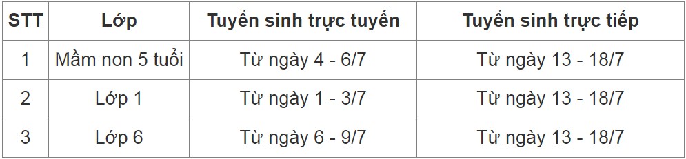 Đối với các trường mầm non, lớp 1, lớp 6: Tuyển sinh bằng hình thức trực tuyến từ 1-9/7 (tuyển sinh lớp 1 từ 1 đến hết 3/7; tuyển sinh trẻ 5 tuổi vào trường mầm non từ 4 đến hết 6/7 và tuyển sinh vào lớp 6 từ 7 đến hết 9/7); tuyển sinh bằng hình thức trực tiếp từ 13/7 đến hết 18/7.