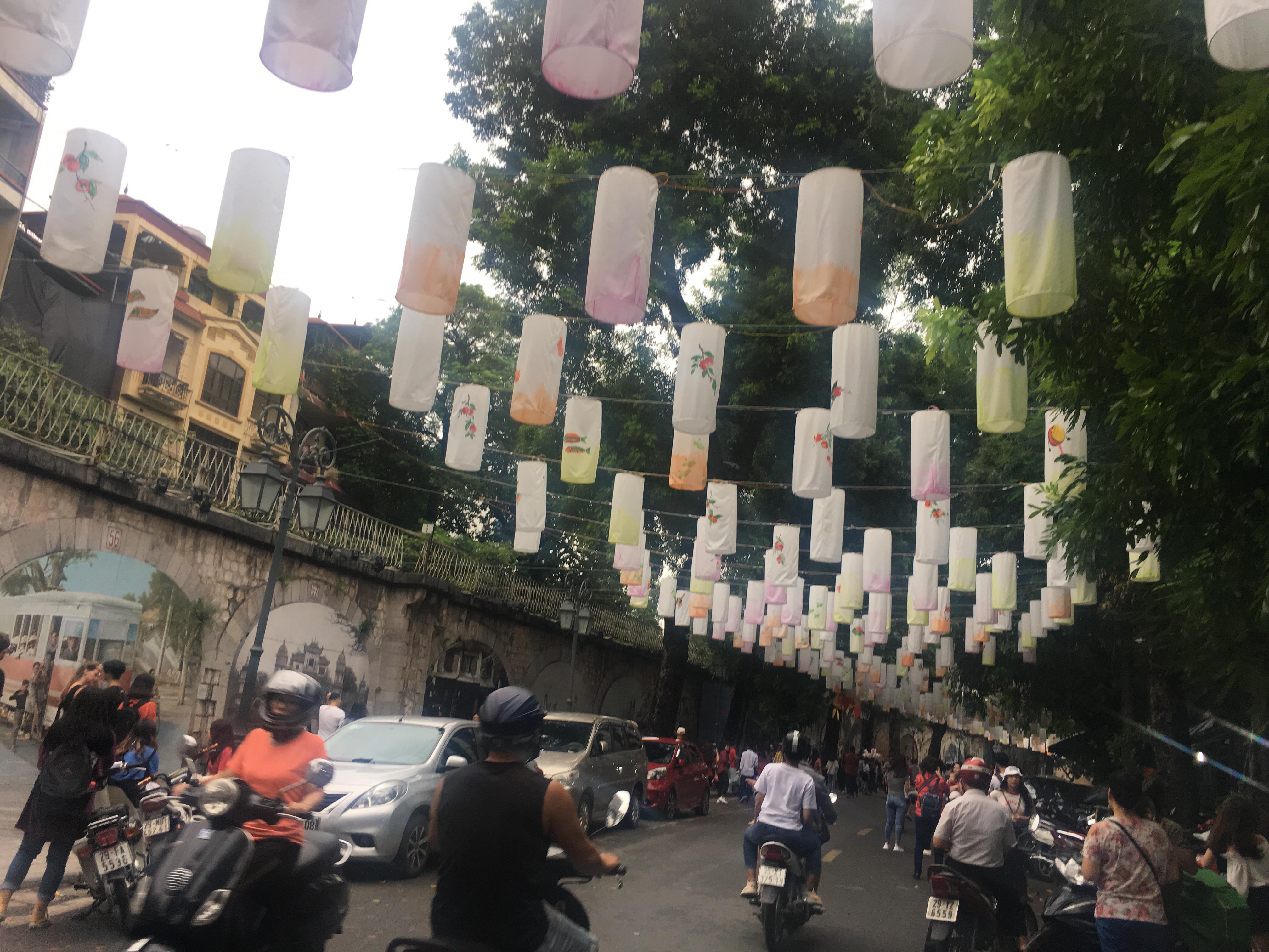 Những chiếc đèn lồng treo rợp trời, lấp ló trong những tán lá của cây ven đường.