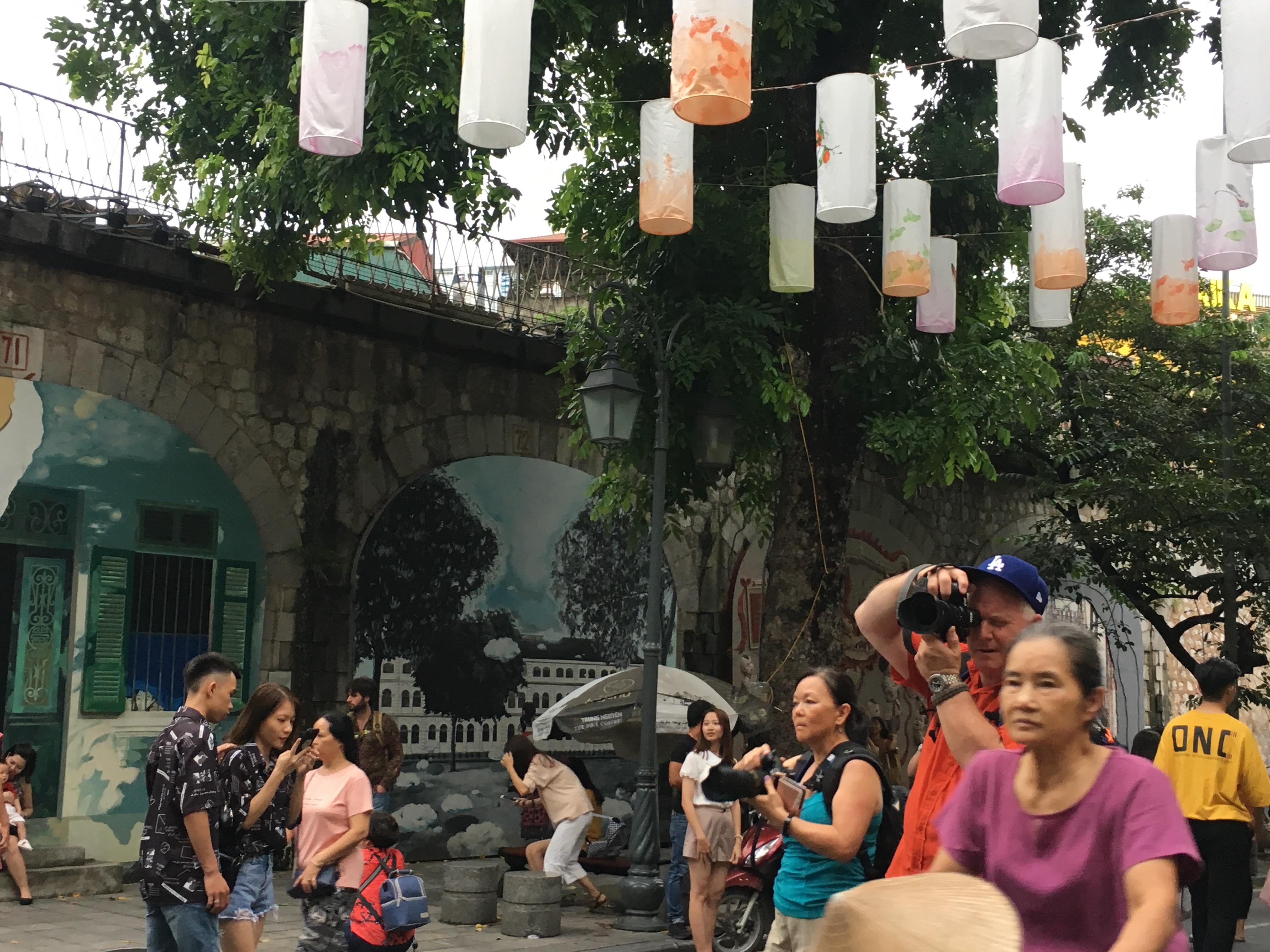 Phố bích họa Phùng Hưng (quận Hoàn Kiếm, Hà Nội) được biết đến là con đường bích họa màu sắc, khu phố đường tàu tấp nập, đông đúc vào dịp Tết hoặc các ngày lễ, cuối tuần. Nhưng gần Trung thu năm nay, tuyến phố phố khoác lên mình diện mạo mới với đèn lồng được trang trí kín đường, trở thành điểm check-in của người dân Hà thành, nhất là các bạn trẻ. Và kể từ khi những hàng đèn lồng được giăng trên đường, nơi này tấp nập, nhộn nhịp hơn hẳn.