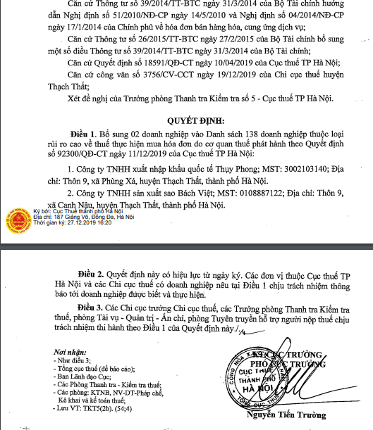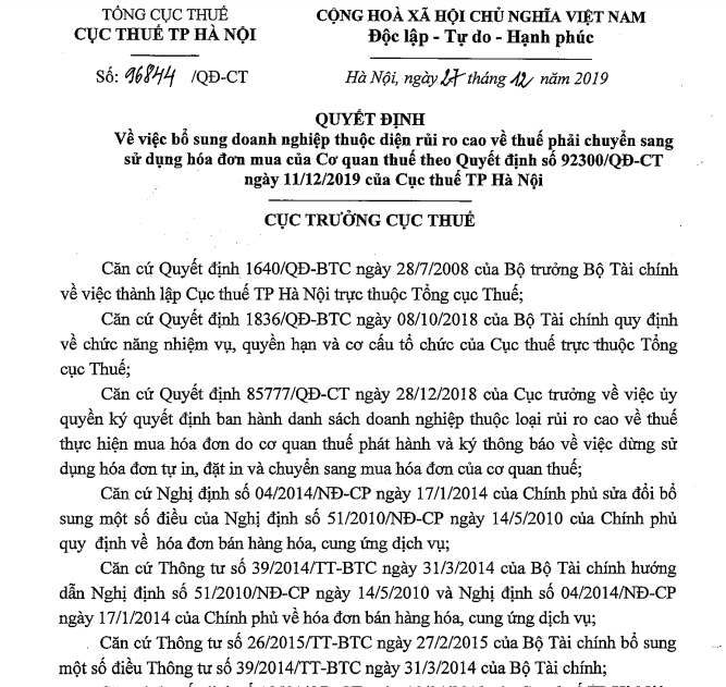Ngày 27/12/2019, Cục thuế Hà Nội đã ra Quyết định số 96884/QĐ-CT về việc bổ sung doanh nghiệp thuộc diện rủi ro cao về thuế phải chuyển sang sử dụng hóa đơn mua của Cơ quan thuế theo Quyết định số 9230/QĐ-CT ngày 11/12/2019 của Cục thuế TP Hà Nội.