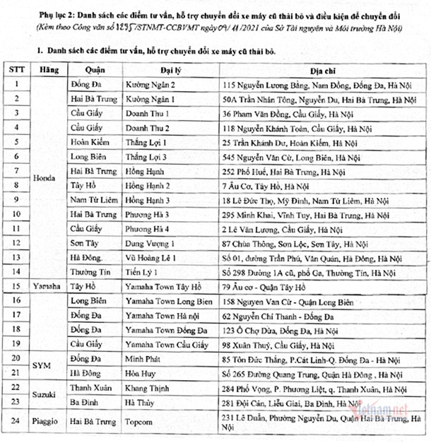Sở TN&MT Hà Nội cho biết đối với xe máy đăng ký lần đầu trước năm 2002 thuộc 5 hãng Honda, Yamaha, Suzuki, Piaggio, SYM, người dân có nhu cầu chuyển đổi sang xe mới sẽ được tư vấn, hướng dẫn.