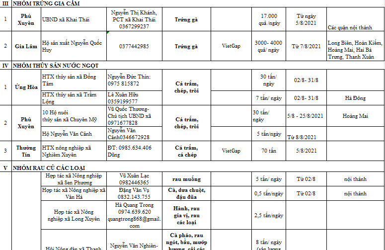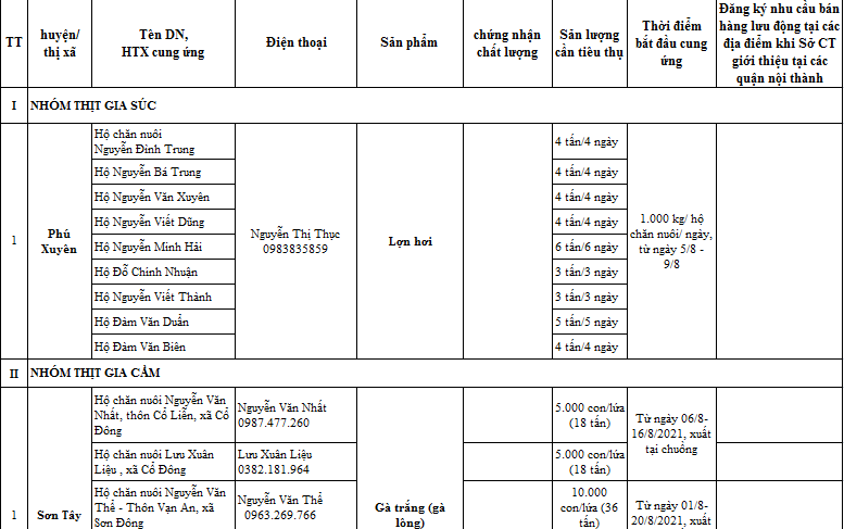 Đến nay, các đơn vị có báo cáo gồm: Phú Xuyên, Thường Tín, Gia Lâm, Ứng Hòa, Phúc Thọ, Mê Linh, Hoài Đức, Chương Mỹ, Quốc Oai và TX Sơn Tây. Trong đó, tại huyện Phú Xuyên có nhiều mặt hàng cần tiêu thụ với số lượng lớn như: Lợn hơi khoảng 1.000kg/hộ chăn nuôi/ngày; Nuôi vịt supper theo mô hình sở Nông nghiệp và Phát triển Nông thôn Hà Nội khoảng 10.000 con (30 tấn); Trứng gà 17.000 quả/ngày; thủy sản khoảng 30 tấn/ngày… Khoảng 2.000 tấn nhãn thương hiệu chín muộn Đại Thành Quốc Oai; Hơn 100 tấn gà trắng đang trong vụ thu hoạch…